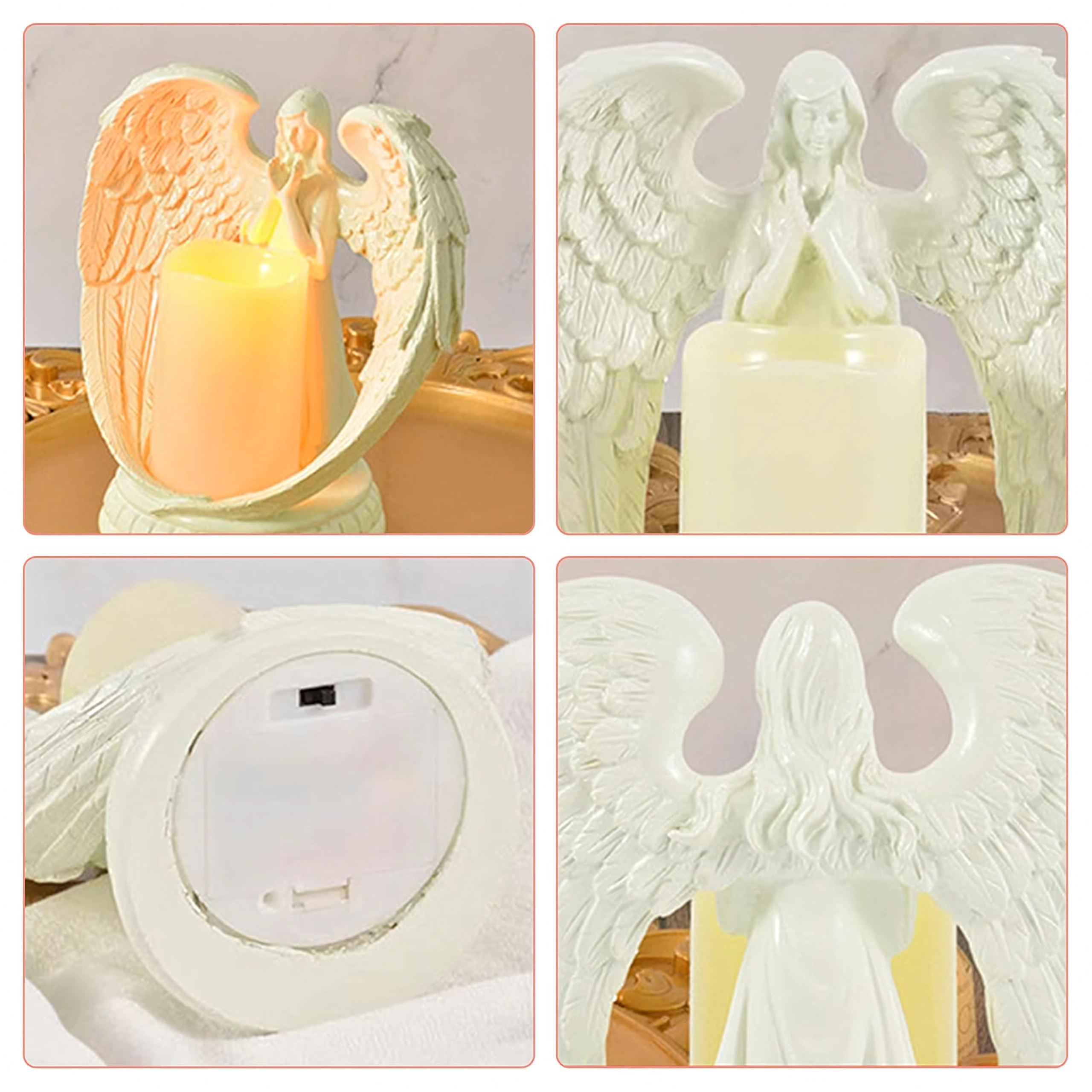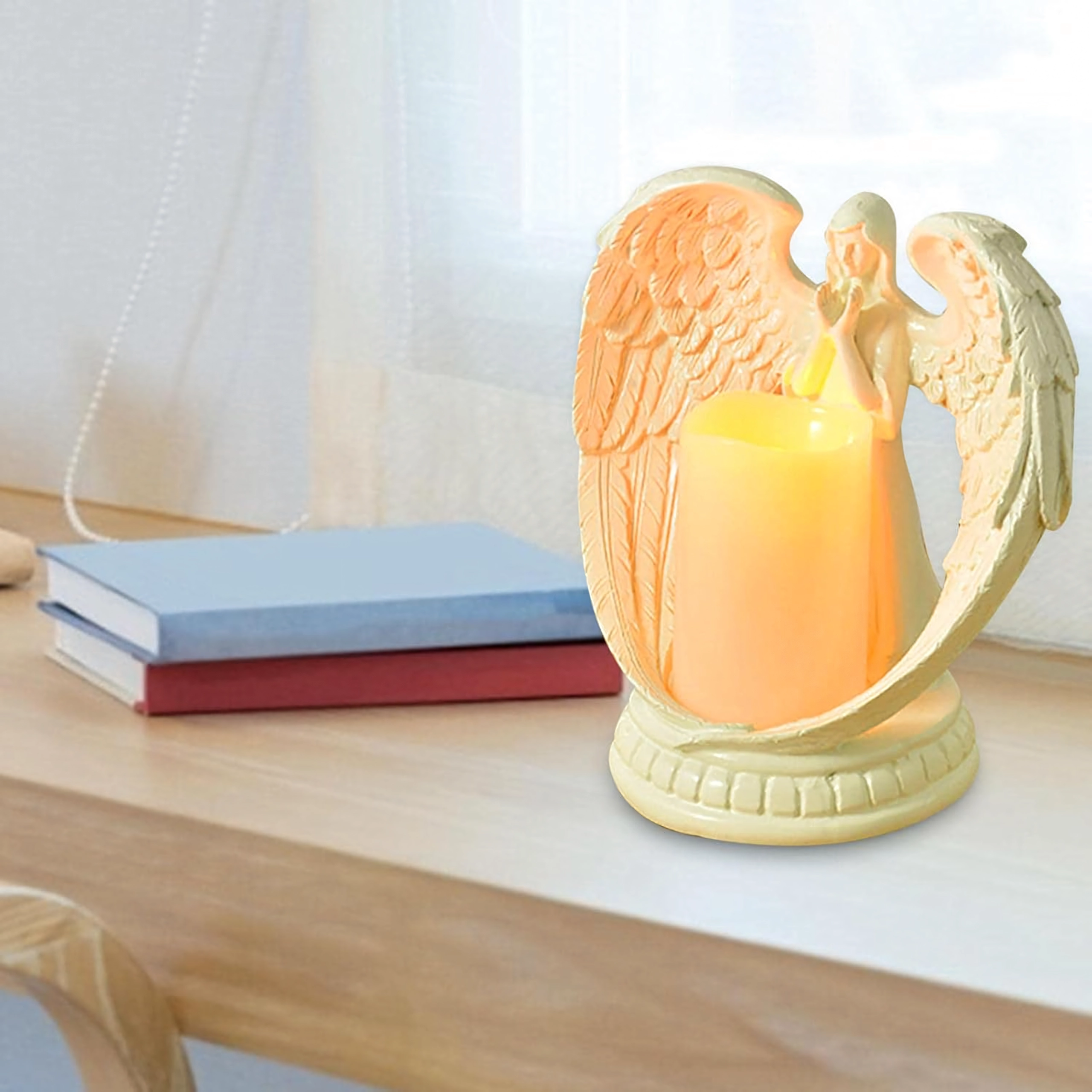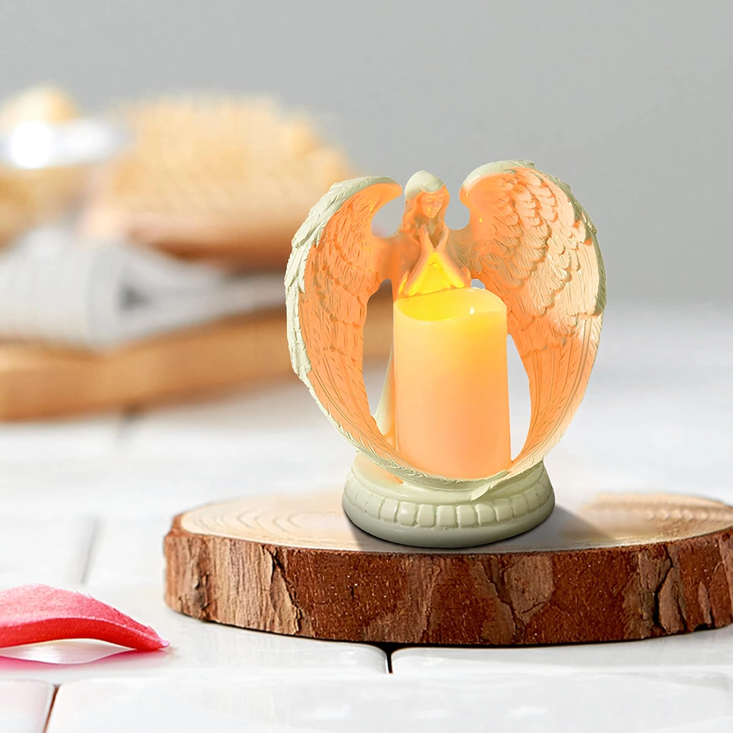 Ange décoratif élégant avec bougie à lumière LED réaliste. Fabriqué en résine polie, il symbolise la paix, le souvenir et la bénédiction. Idéal pour l’intérieur, les cérémonies religieuses, les sépultures et comme cadeau d’exception.