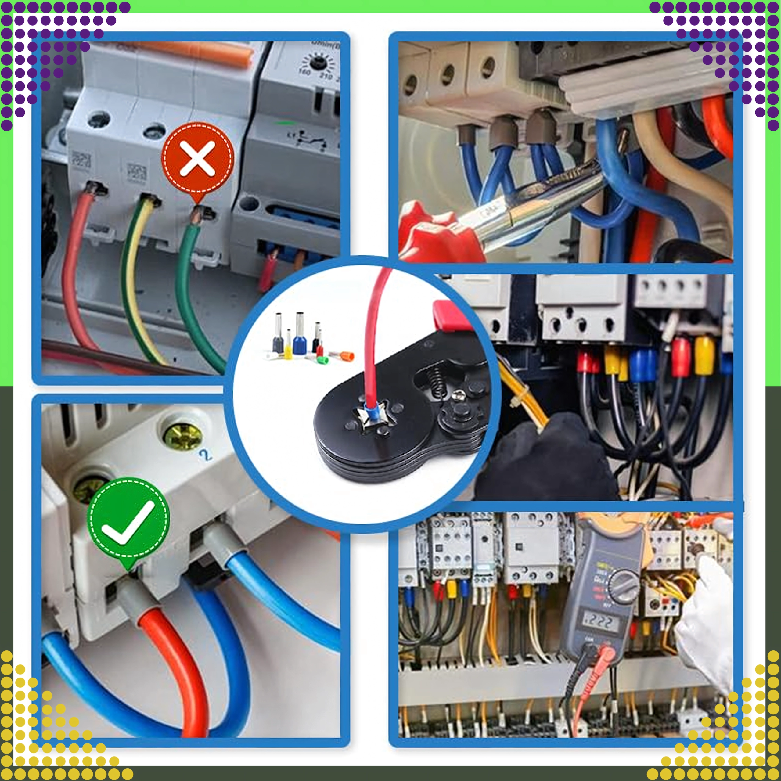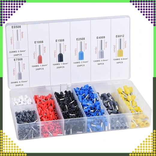 Ensemble complet de cosses tubulaires isolées pour conducteurs avec au total 1200 pièces en 7 tailles. Idéal pour les installations électriques professionnelles et l’atelier à domicile. Les tailles codées par couleur permettent une sélection rapide et une finition précise des conducteurs toronnés. Améliore la fiabilité des connexions, protège contre l’effilochage des brins et facilite le montage dans les bornes à vis.