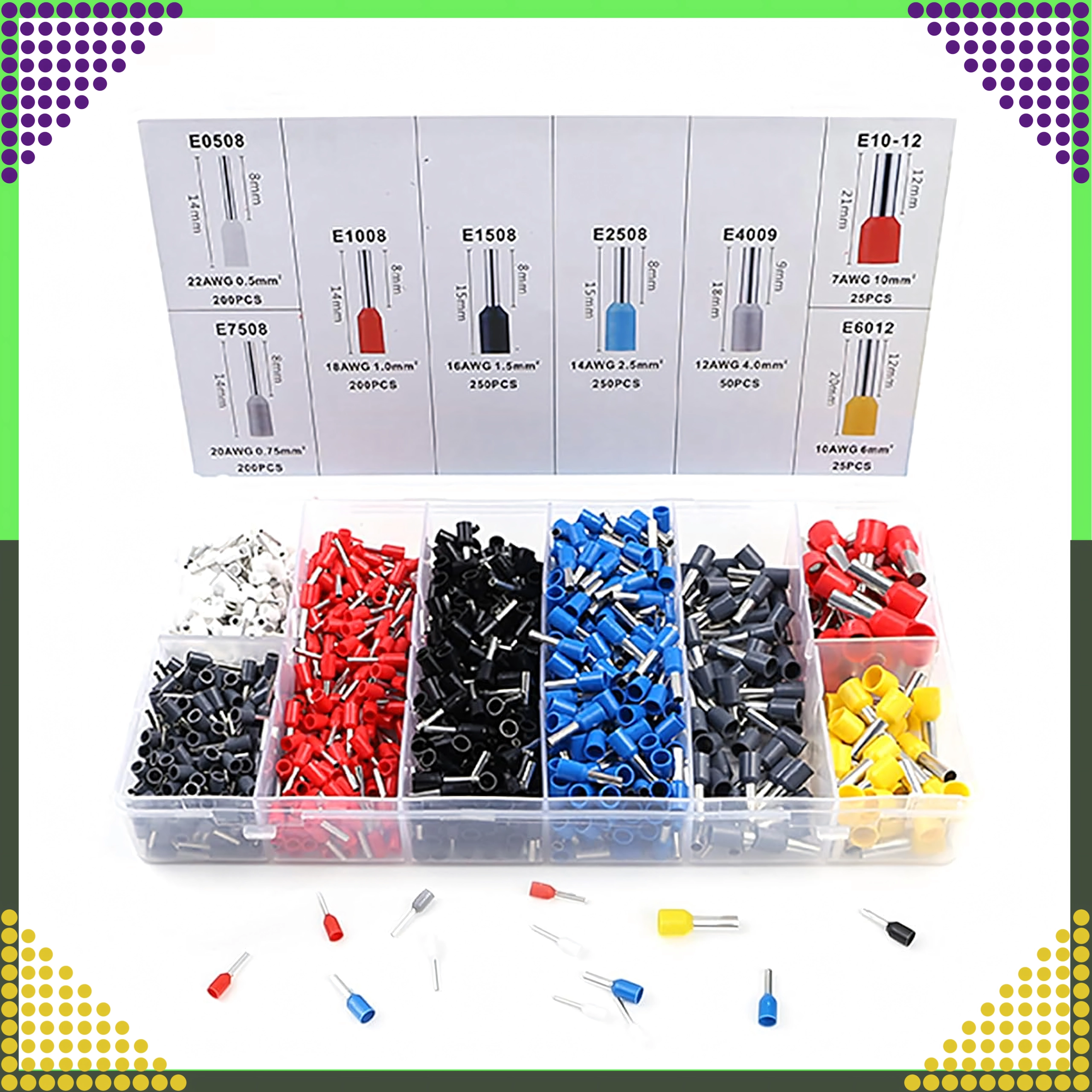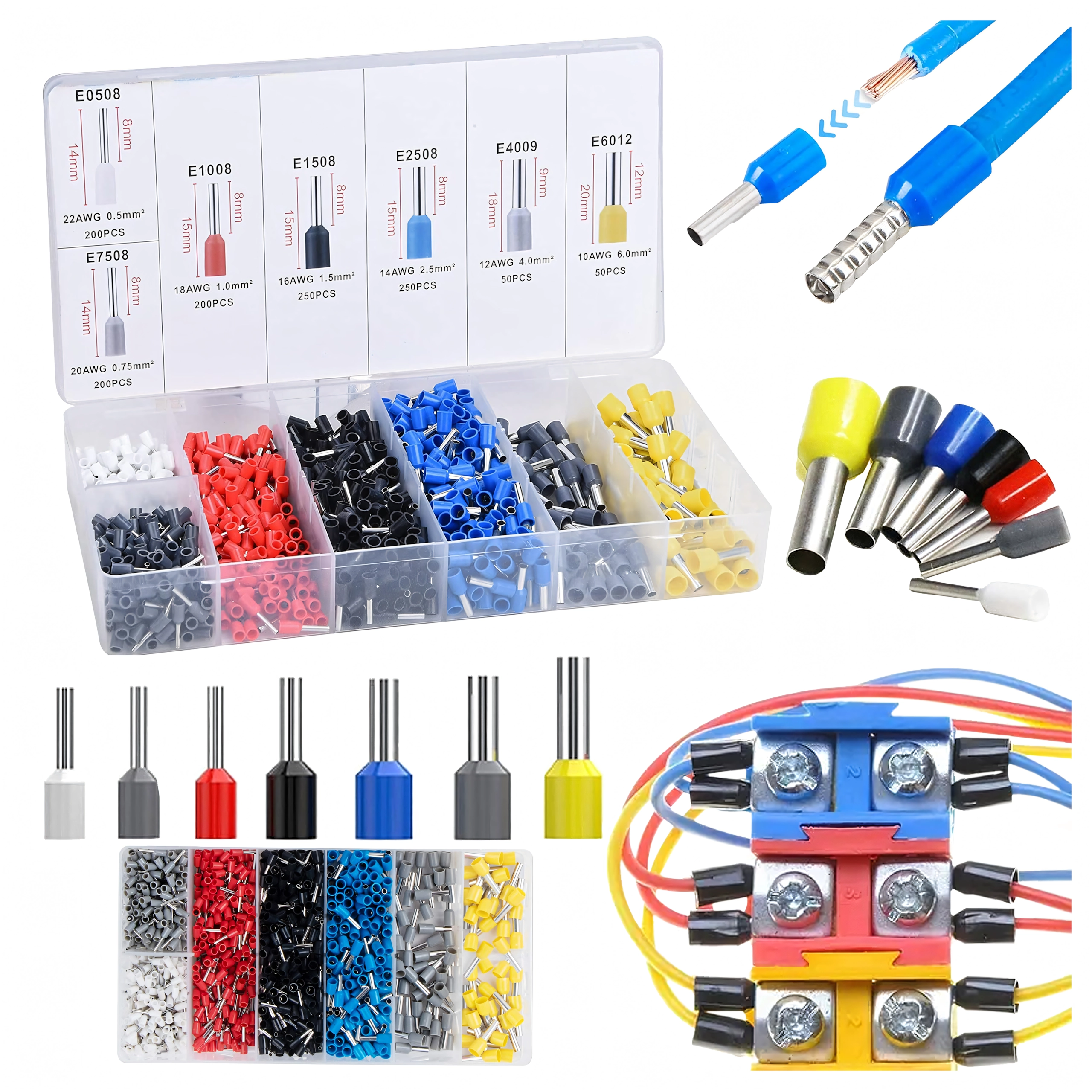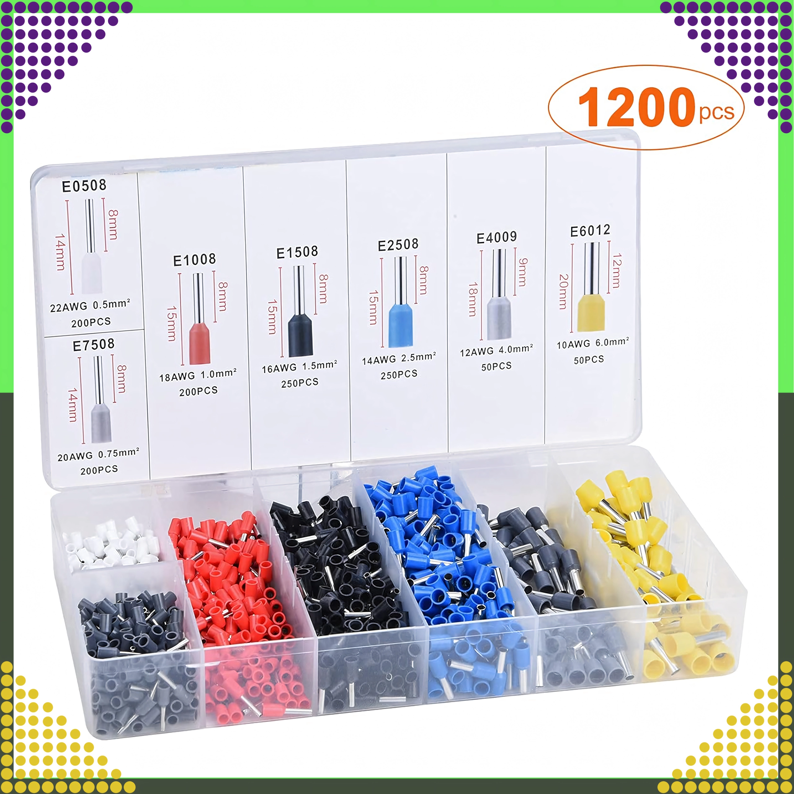 Set de cosses tubulaires isolées pour conducteurs, 1200 pcs, plusieurs tailles et couleurs