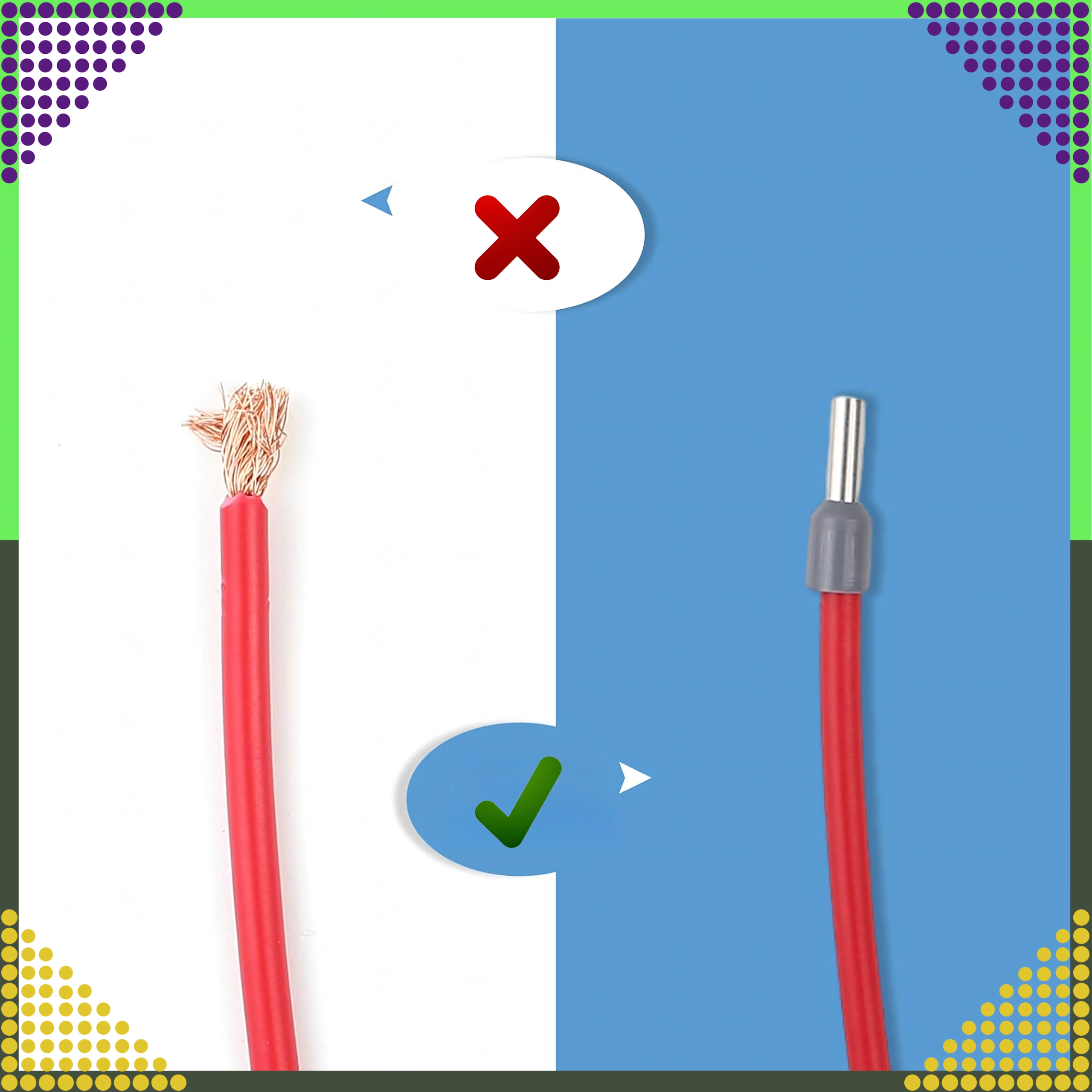 Un insert métallique et une collerette isolante assurent un sertissage sûr sur le conducteur toronné et une connexion stable dans les bornes à vis sans effilochage des brins.