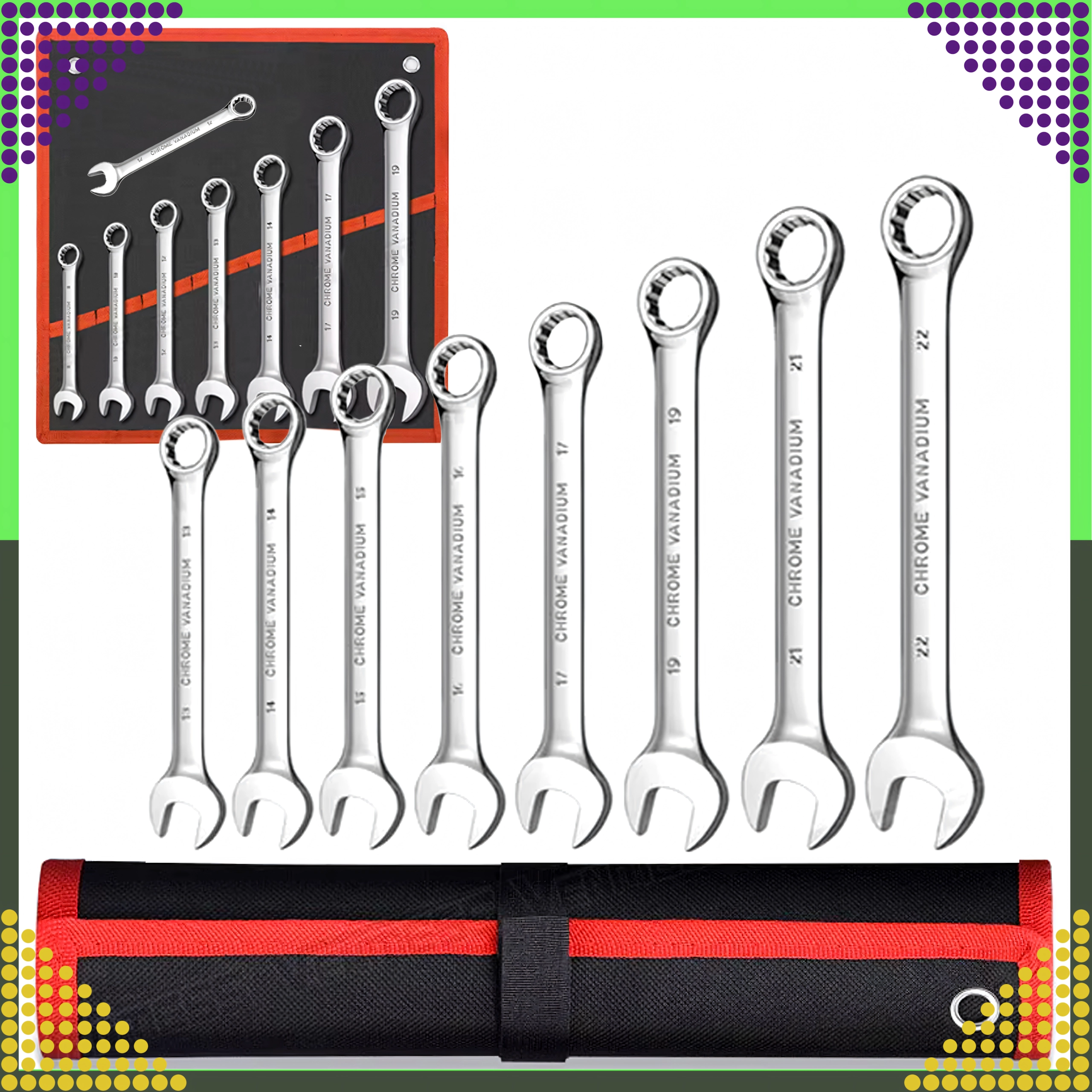 L’éventail de tailles de 8 à 22 mm couvre les dimensions les plus courantes pour l’atelier auto, le vélo, la maintenance des machines et les réparations domestiques. Le profil fin et la fabrication précise permettent de travailler même dans des zones étroites. Le rouleau-étui pratique garde les outils organisés et faciles à transporter.