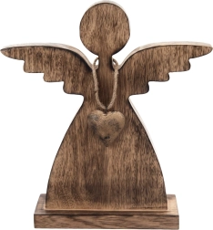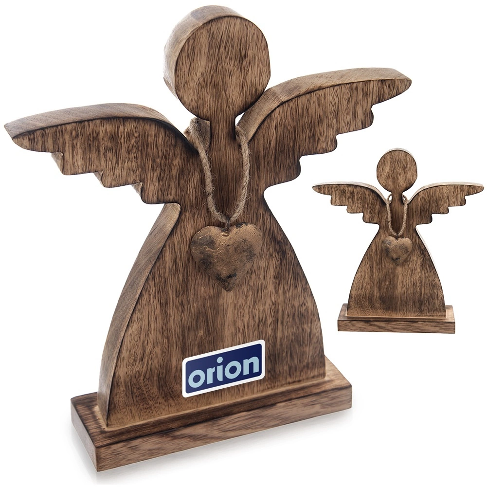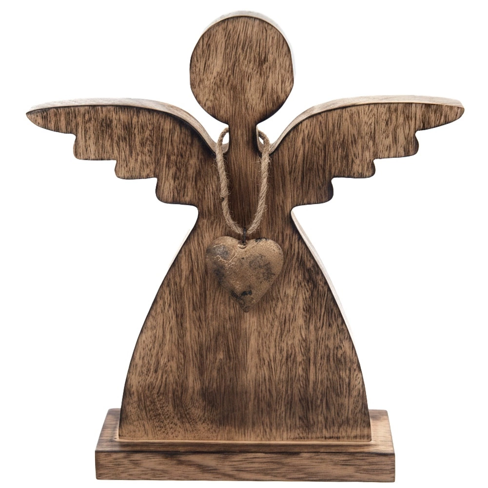 Cet ange en bois de manguier naturel apporte calme et atmosphère chaleureuse à la maison. Des lignes minimalistes, des ailes délicatement stylisées et un petit cœur métallique doré composent une combinaison intemporelle, idéale pour les intérieurs modernes comme rustiques. Le socle stable garantit une installation sûre sur une table, une étagère ou une commode.