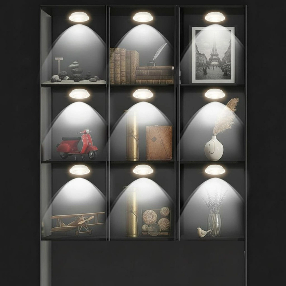 Ensemble pratique de six lampes LED puck sans fil avec télécommande pour armoires, cuisine, chambre et escaliers. Elles offrent une faible consommation, des dimensions compactes, un variateur et une minuterie 30 minutes. Grâce à l’alimentation par piles et à une installation facile, c’est la solution idéale pour un rétroéclairage rapide et élégant des étagères, niches et placards sans câbles.