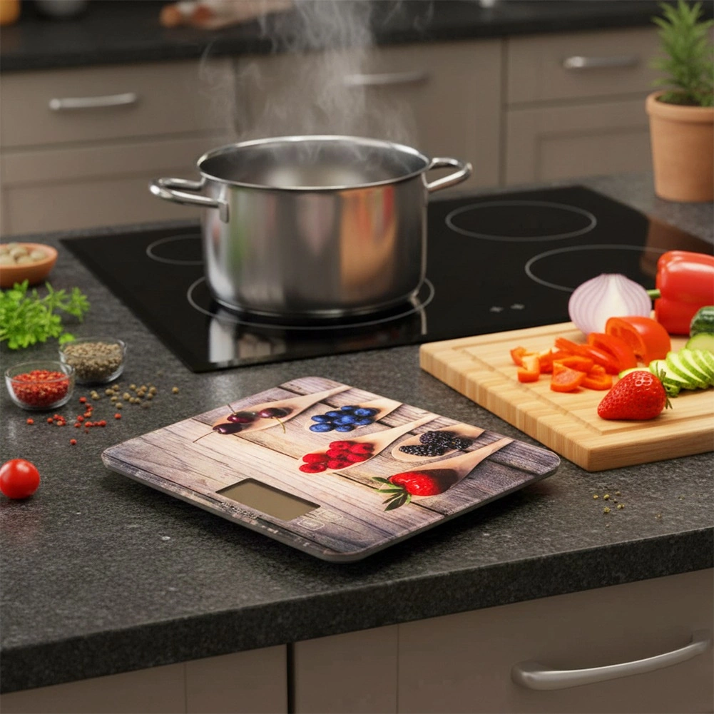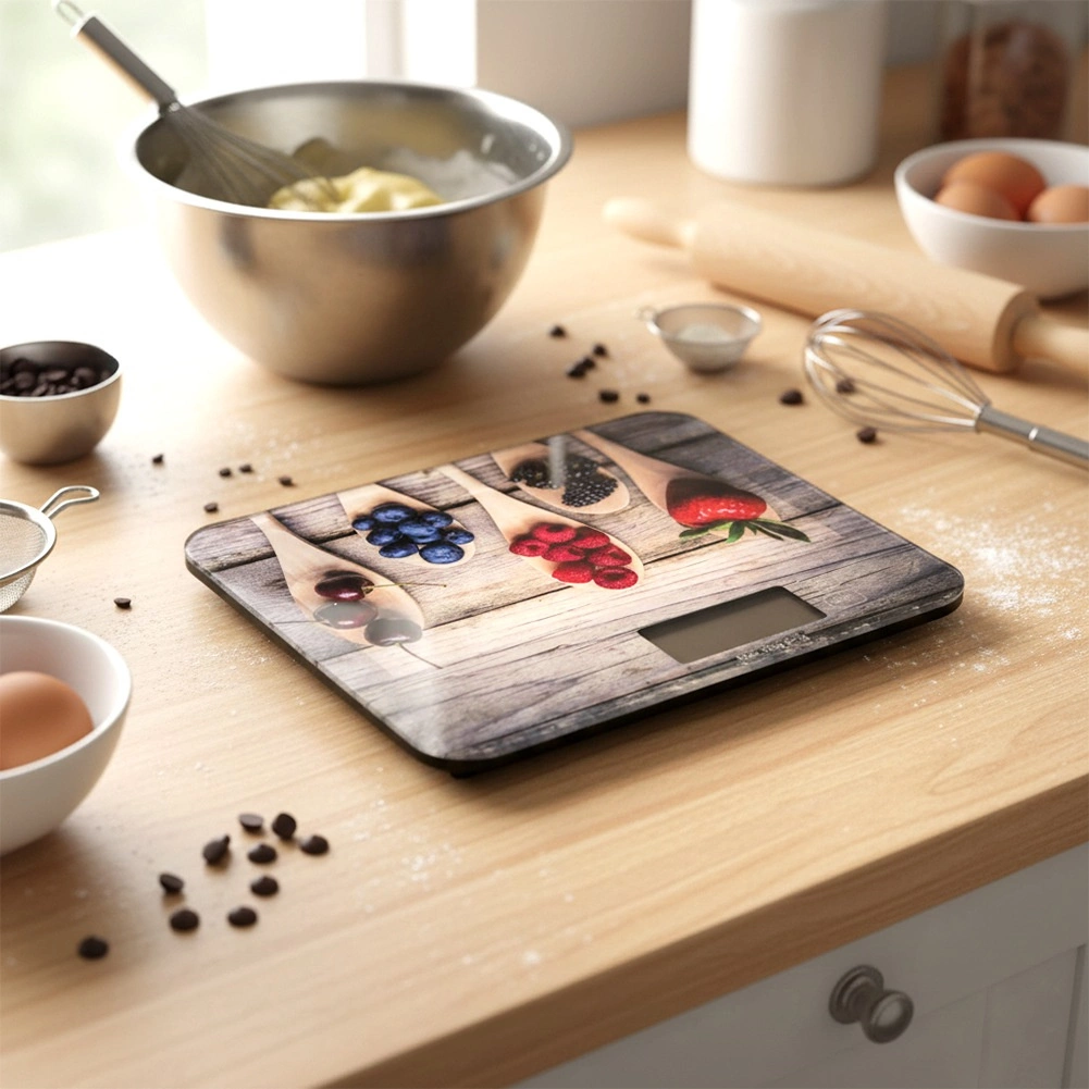 Cette balance de cuisine numérique allie look moderne et praticité. Le verre trempé à motif décoratif de fruits est durable et facile à entretenir, tandis que le grand écran LCD assure une lecture confortable et rapide. Grâce à sa capacité de 15 kg, elle convient aussi bien aux petits ingrédients qu’aux récipients plus lourds.