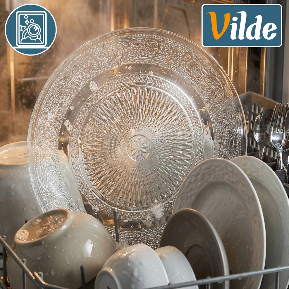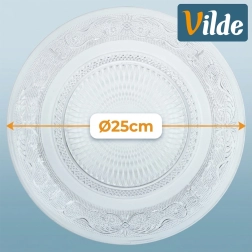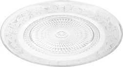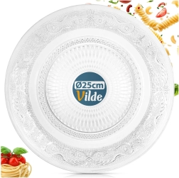 Assiette en verre élégante de 25 cm de diamètre avec un décor en relief rappelant le cristal. Polyvalente et pratique pour le quotidien comme pour les occasions. Peut être utilisée comme assiette peu profonde ou comme plateau pour desserts et amuse-bouches. Compatible lave-vaisselle, verre transparent de qualité, design classique et utilisation polyvalente à la maison comme en restauration.