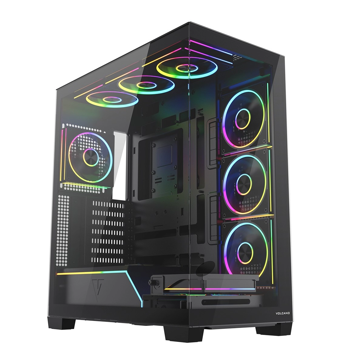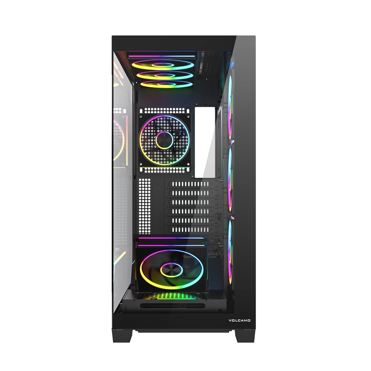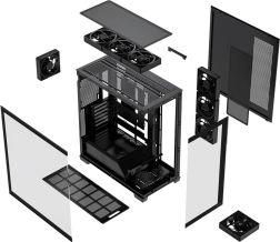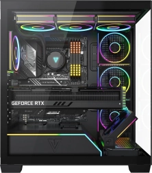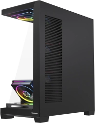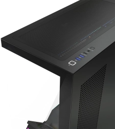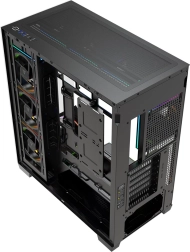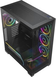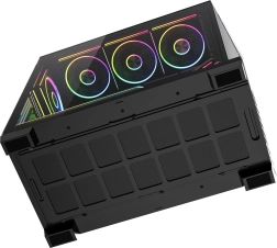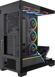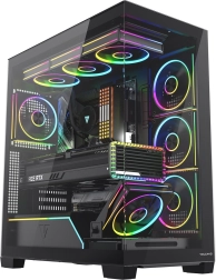 Boîtier stylé pour joueurs et créateurs avec design panoramique « aquarium » en verre trempé, huit ventilateurs ARGB PWM et un ruban LED ARGB. Il offre un flux d’air de haut niveau, de la place pour une GPU jusqu’à 420 mm, un ventirad CPU jusqu’à 175 mm, la prise en charge d’un refroidissement liquide jusqu’à 360 mm et une compatibilité avec les cartes mères à connecteurs inversés (BTF). Des panneaux latéraux à dégagement rapide sans vis, des filtres anti‑poussière et un USB‑C sur le panneau I/O soulignent la fonctionnalité et le design.