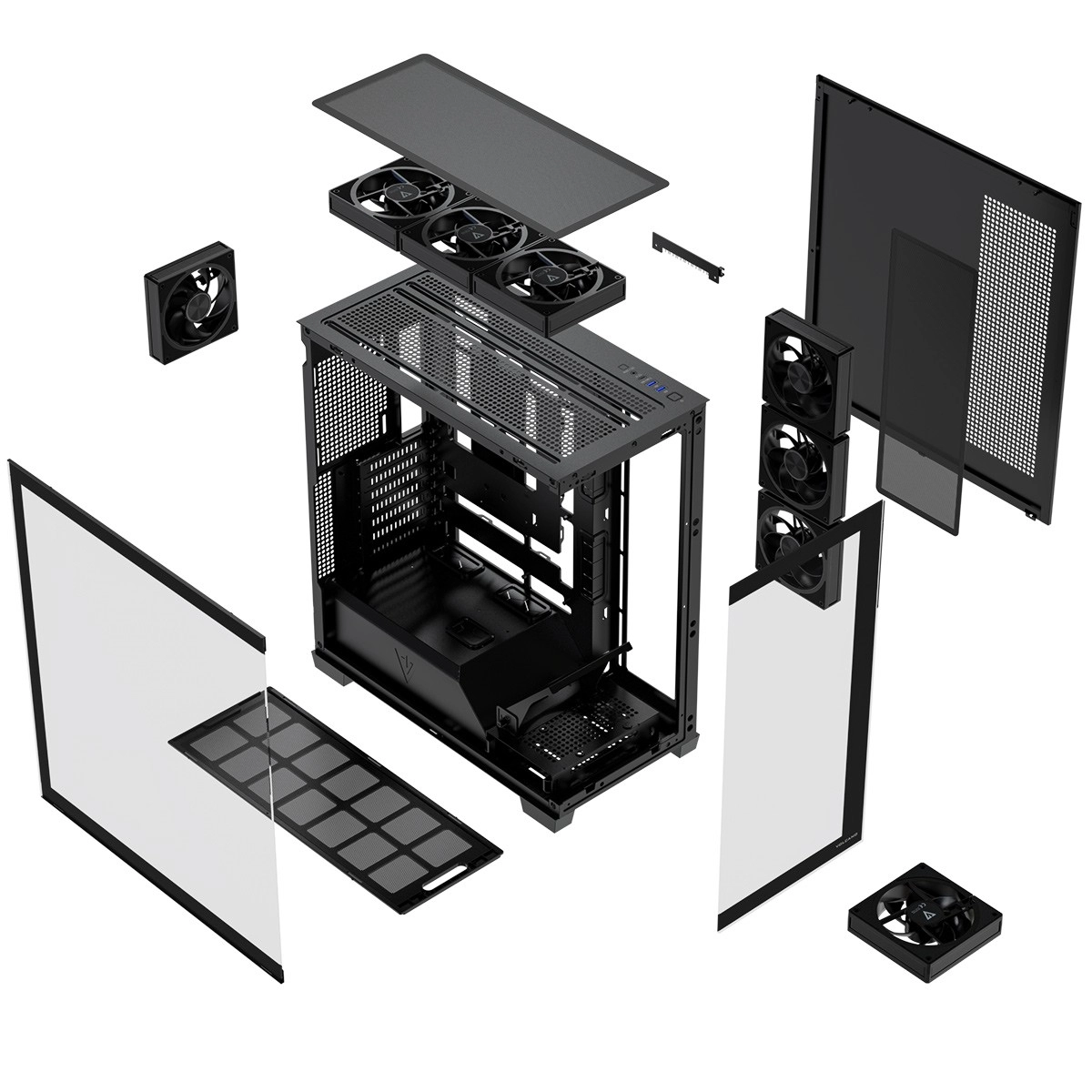 Les panneaux avant et latéral en verre trempé mettent en valeur la configuration. Les panneaux latéraux à dégagement rapide par clips facilitent l’installation et la maintenance sans outils.