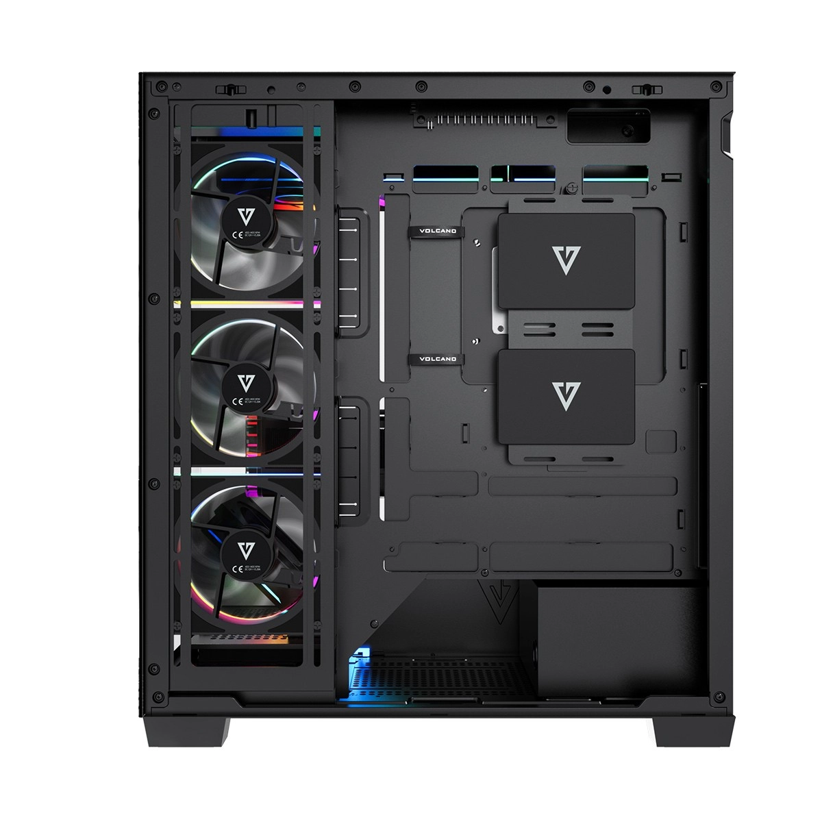 - 8× 120 mm ARGB (3× à pales inversées près du plateau, 1× arrière 120 mm ARGB, 1× 120 mm ARGB sur cadre rabattable vers la GPU, 3× supérieurs 120 mm ARGB)