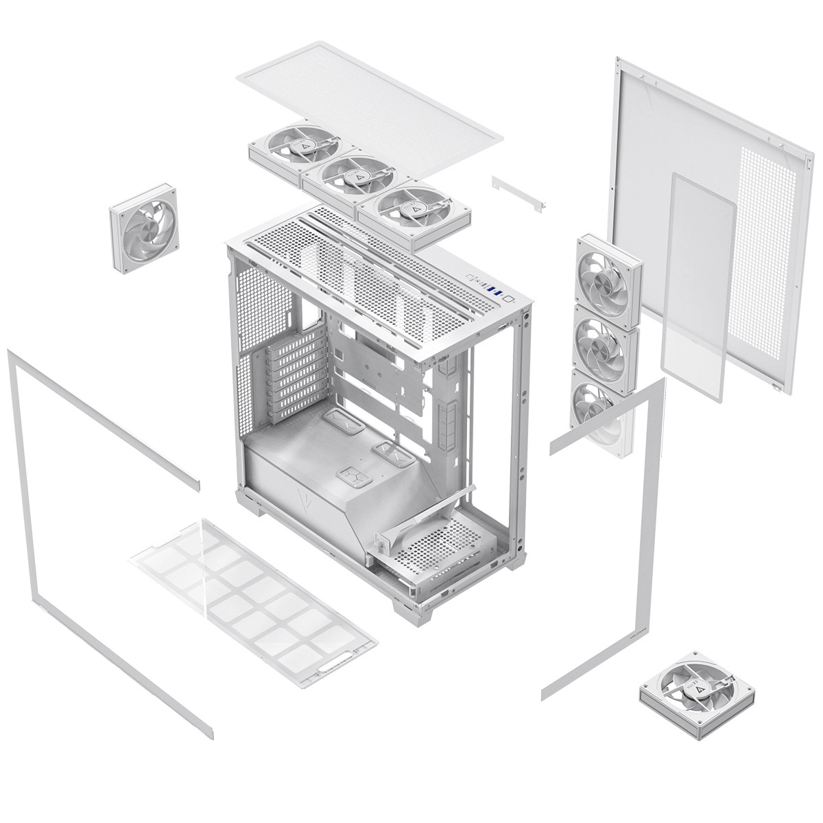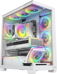 Équipé d’usine de 8× 120 mm ARGB (dont 3 à pales inversées) et d’un cadre orientant l’air directement vers la GPU. Températures stables même lors de longues sessions de jeu.