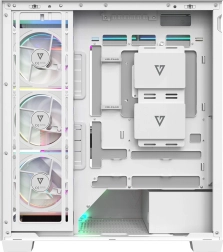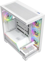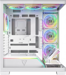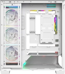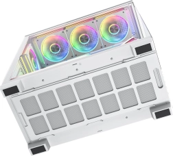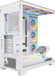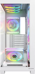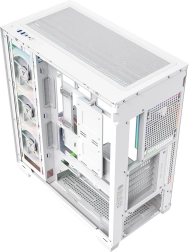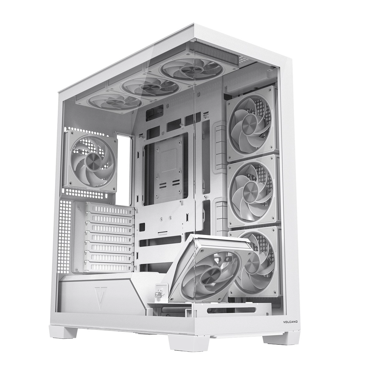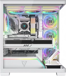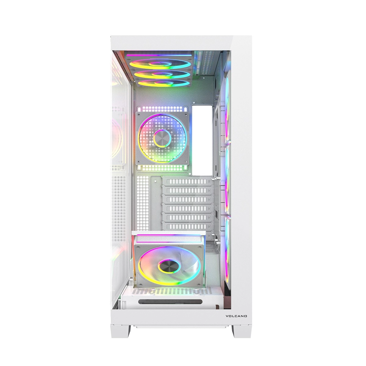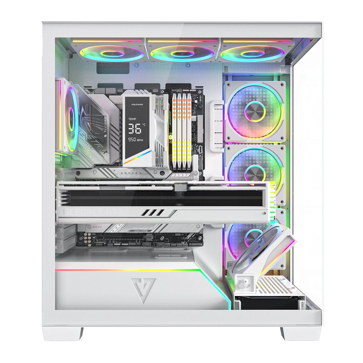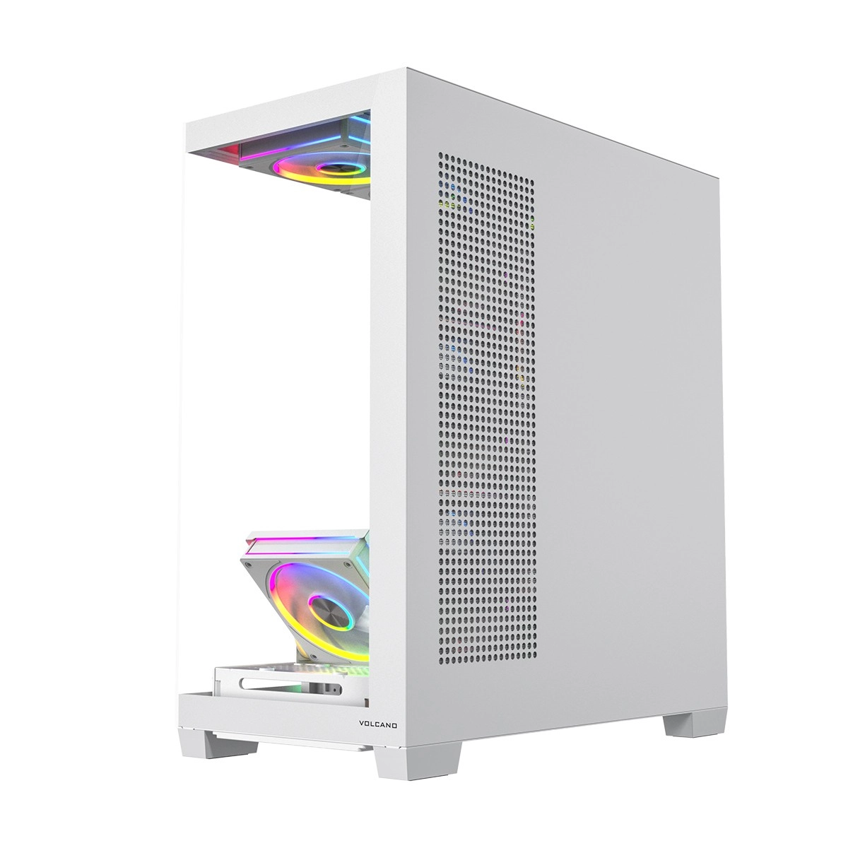 Volcano Stellar Plus ARGB combine un design « aquarium » attrayant avec un excellent flux d’air. Huit ventilateurs PWM ARGB, dont trois à pales inversées, et un cadre latéral orientable pour souffler sur la GPU maintiennent les températures sous contrôle lors de longues sessions de jeu. Le verre trempé sur le côté et à l’avant expose efficacement les composants, tandis que le ruban LED ARGB sur le tunnel de l’alimentation apporte un effet visuel « wow ».