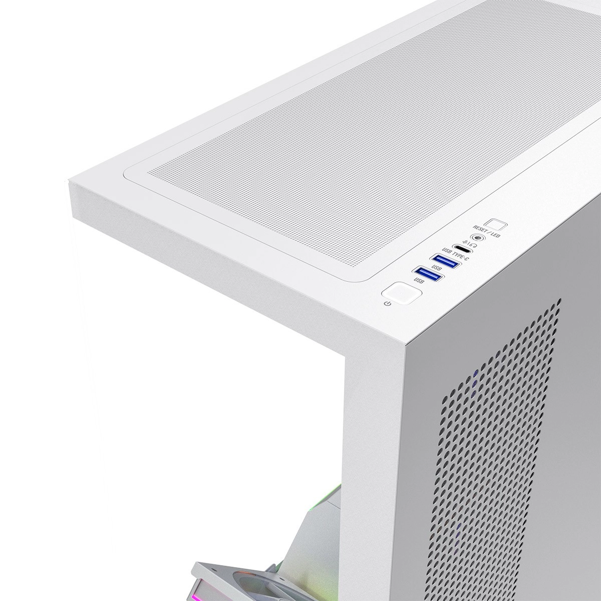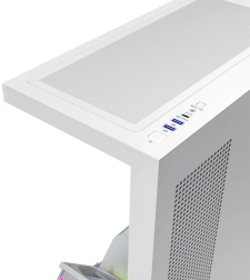 Les panneaux avant et latéral en verre trempé mettent en valeur les composants et l’éclairage ARGB. Un ruban LED sur le tunnel de l’alimentation souligne le look épuré.