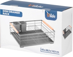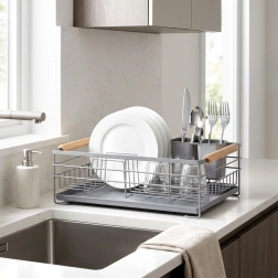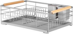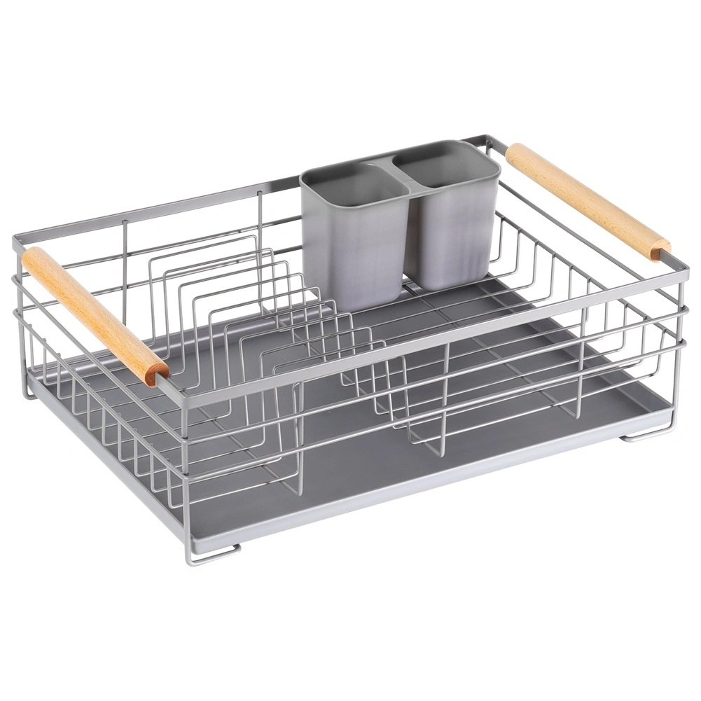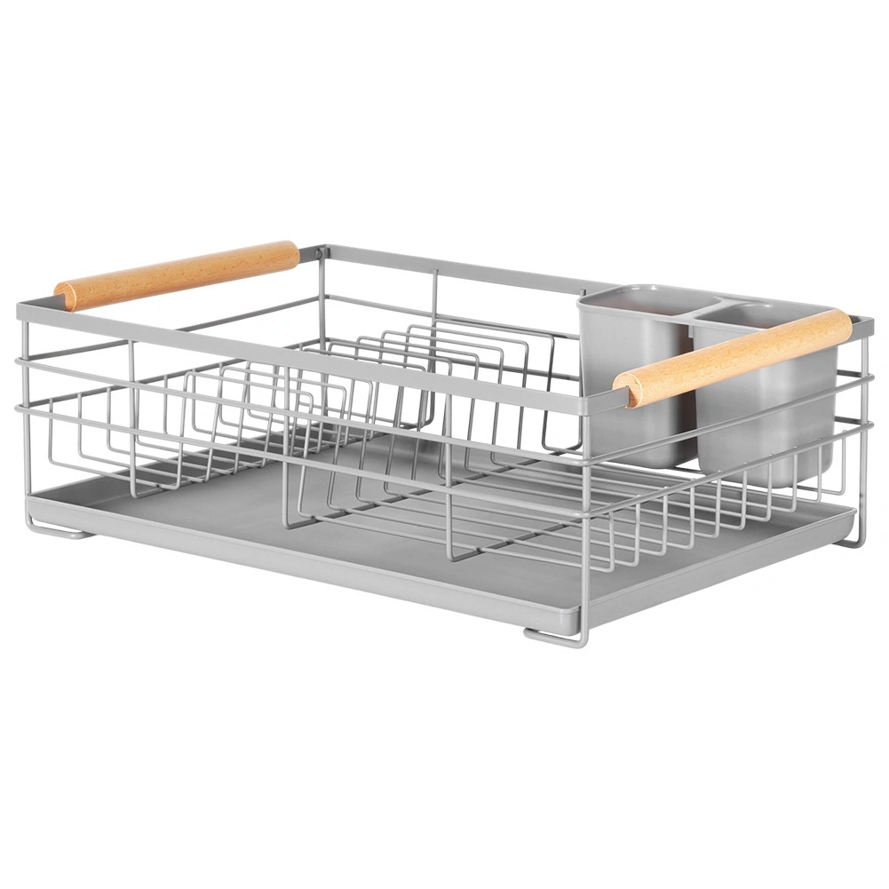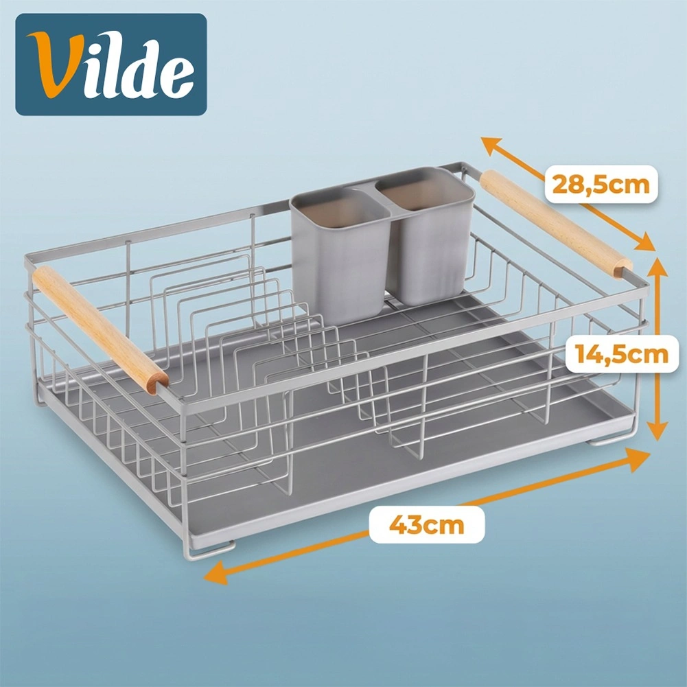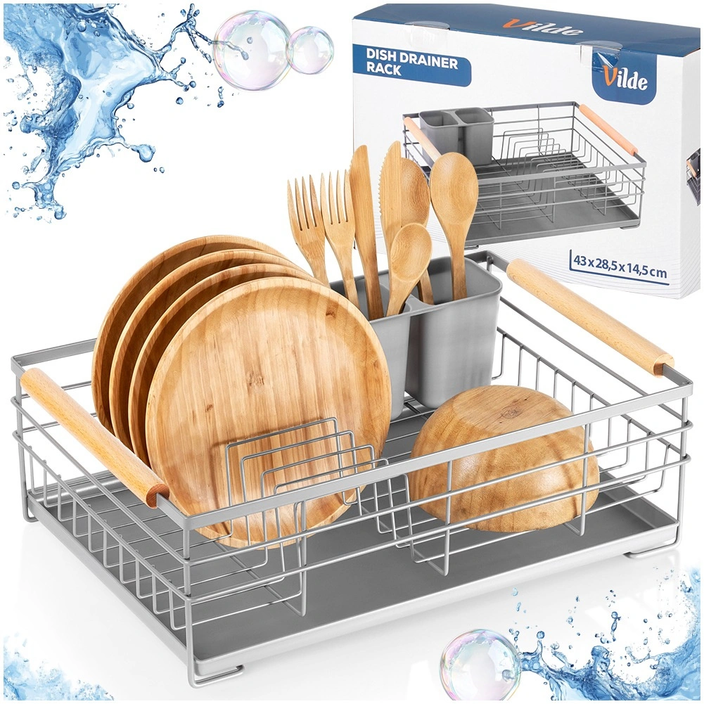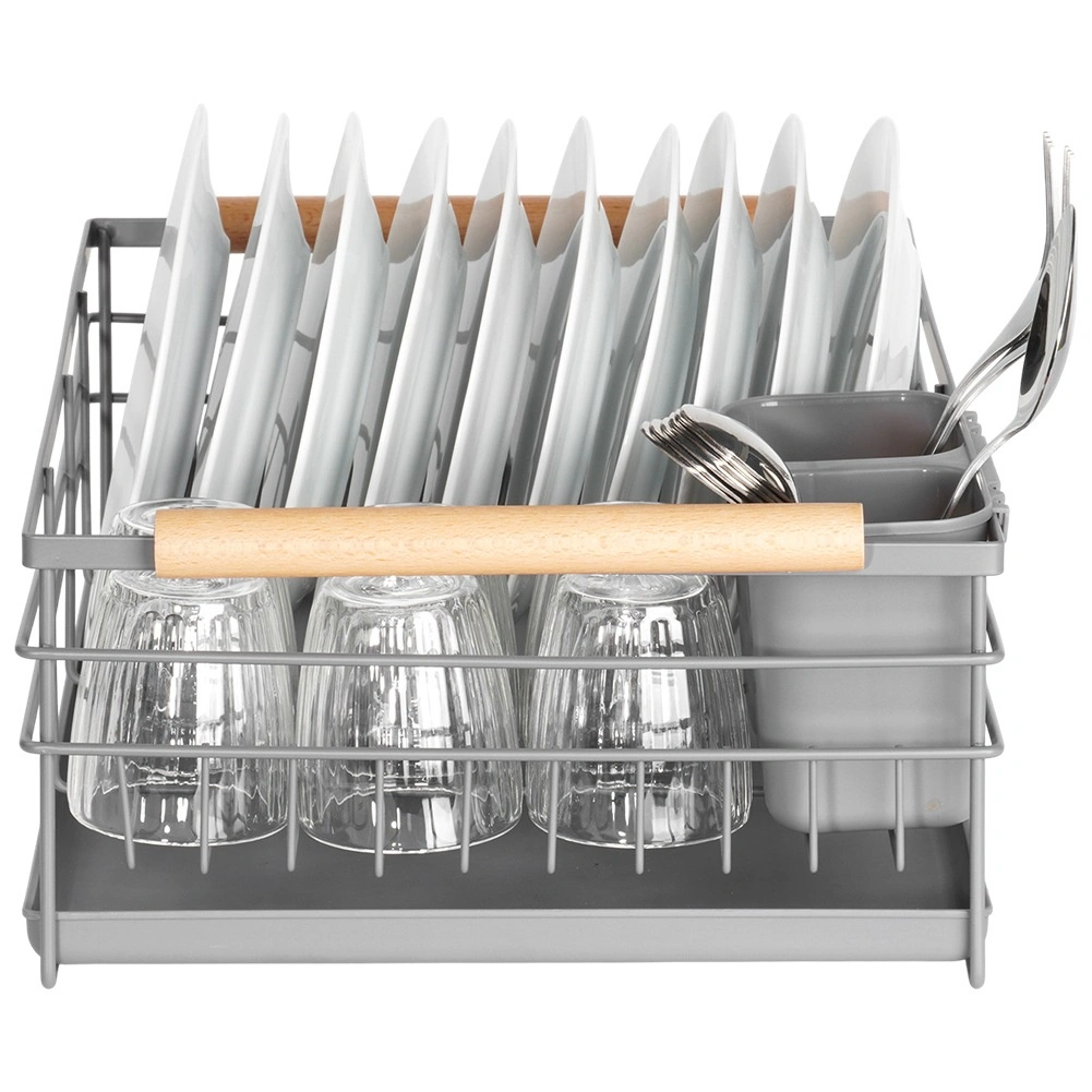 Pratique égouttoir à vaisselle gris de 43 × 28,5 × 14,5 cm qui apporte ordre et sécheresse au plan de travail. Il offre un plateau d’égouttage amovible, un panier à couverts à deux compartiments et de la place pour jusqu’à 10 assiettes. Grâce à sa structure métallique robuste et à ses poignées en bois, il est stable, facile à transporter et s’intègre parfaitement aux cuisines modernes comme classiques.