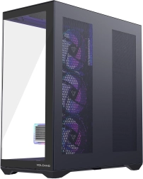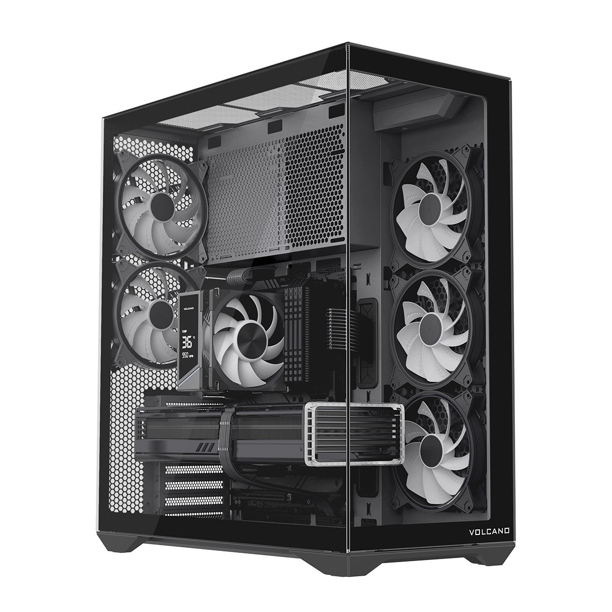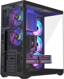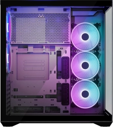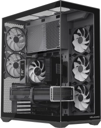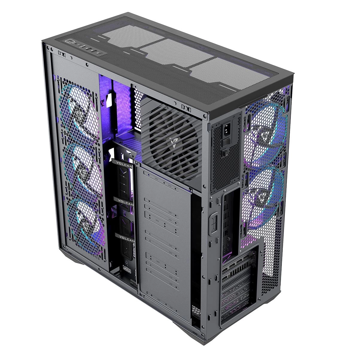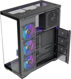 L’espace interne est prêt pour les cartes mères E‑ATX, les cartes graphiques longues et un refroidissement liquide étendu avec des radiateurs jusqu’à 420 mm. Un flux d’air optimisé est assuré par cinq ventilateurs ARGB 140 mm préinstallés (3× latéraux en configuration reversed, 2× arrière), maintenant des températures stables même lors de longues sessions de jeu.