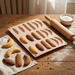 Ce moule en silicone beige est idéal pour la pâtisserie maison de biscuits, mini gâteaux, ainsi que pour la réalisation de pralines et desserts sans cuisson. Grâce à son matériau souple et antiadhésif, les pièces finies se démoulent facilement sans déformation et le moule se nettoie ensuite en toute simplicité.