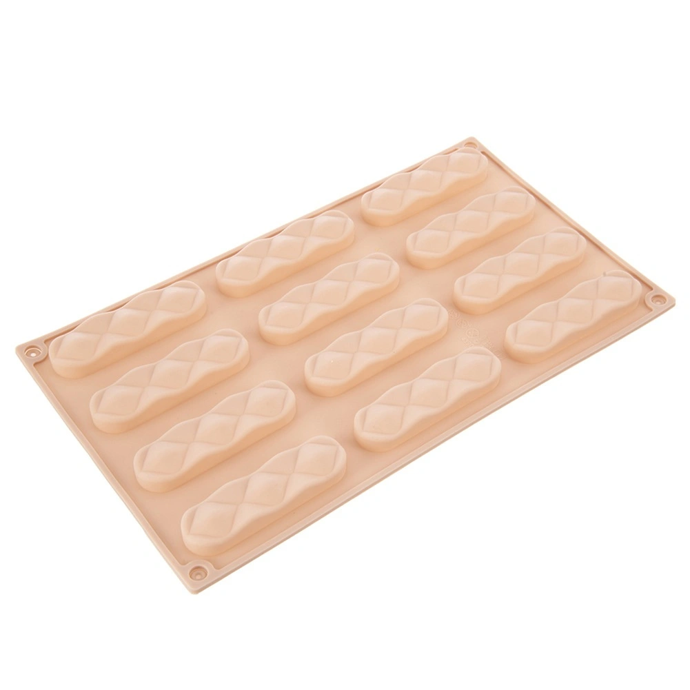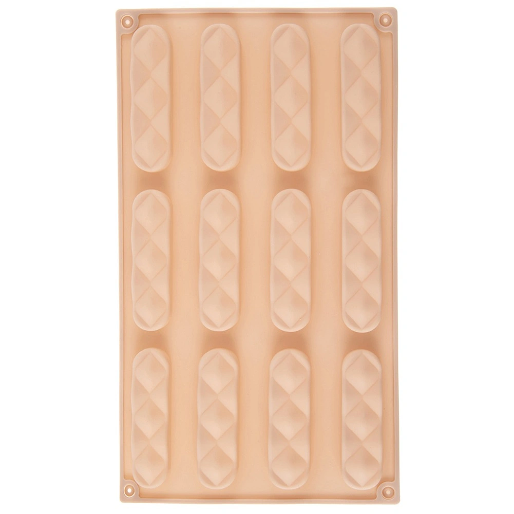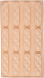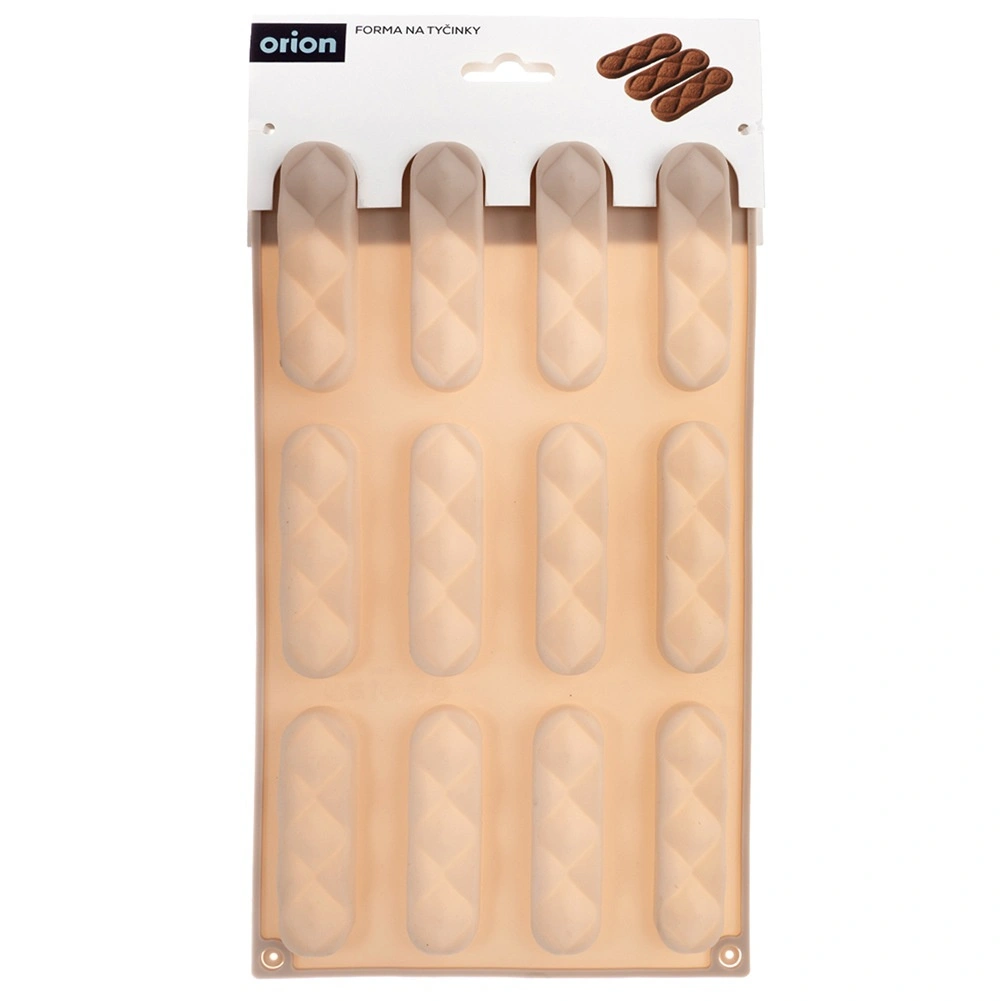Ce moule en silicone beige doté de 12 cavités longitudinales (chacune env. 8 × 2 × 1 cm) est idéal pour des biscuits à la vanille, au cacao ou aux noix, des barres ou des pralines maison. Grâce au silicone souple, la pâtisserie se démoule facilement après la cuisson et conserve une forme uniforme avec une texture attrayante.