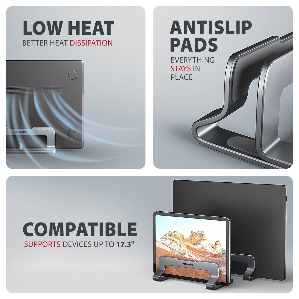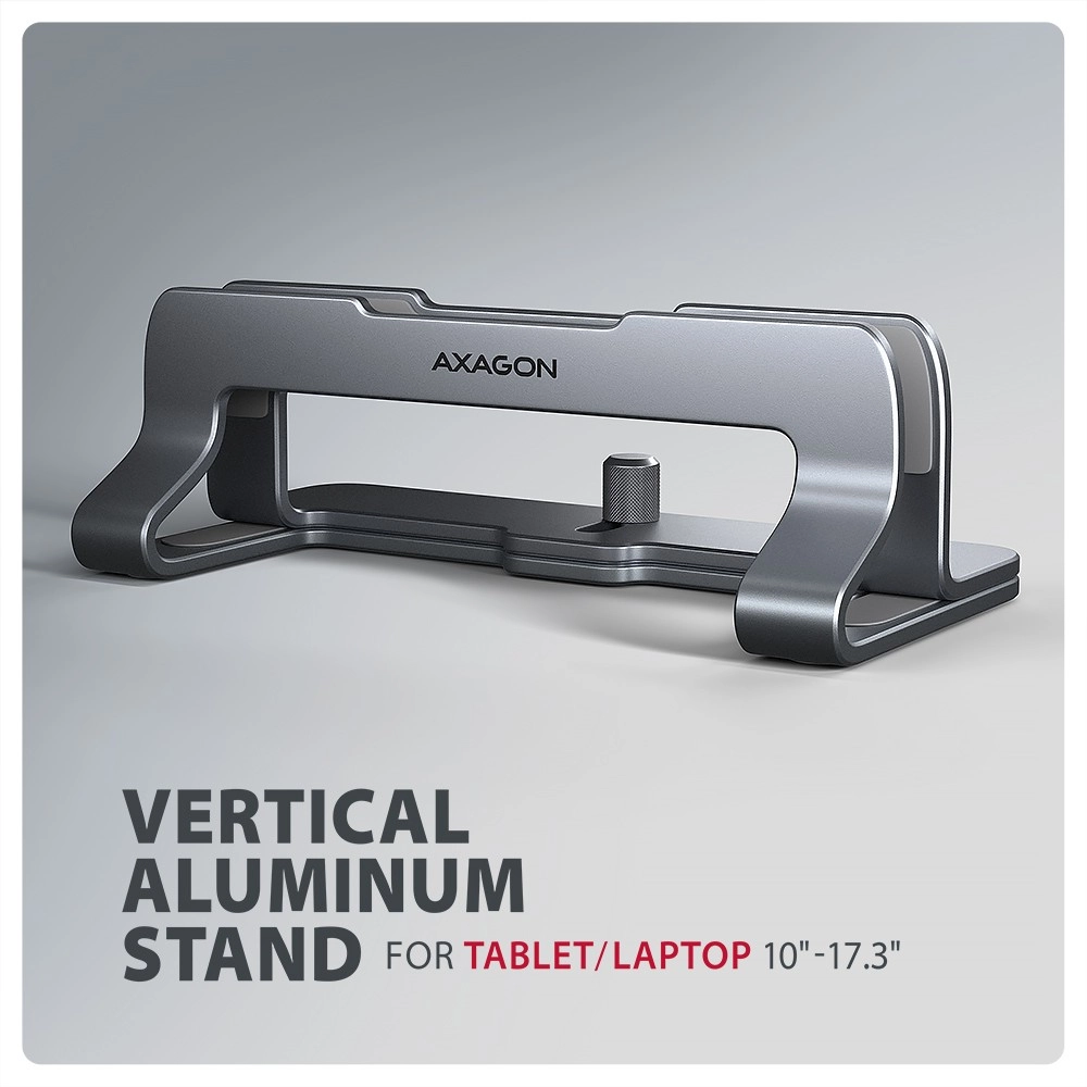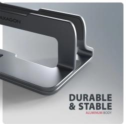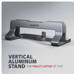Le support élégant et pratique AXAGON STND-VG maintient votre ordinateur portable ou tablette en position verticale, économise de la place sur le bureau et favorise un meilleur refroidissement. Grâce à sa largeur réglable de 9,5 à 25,5 mm, il convient à la plupart des appareils avec une diagonale de 10–17,3". Sa structure en aluminium solide avec surface antidérapante protège l’appareil contre les rayures et les mouvements indésirables.