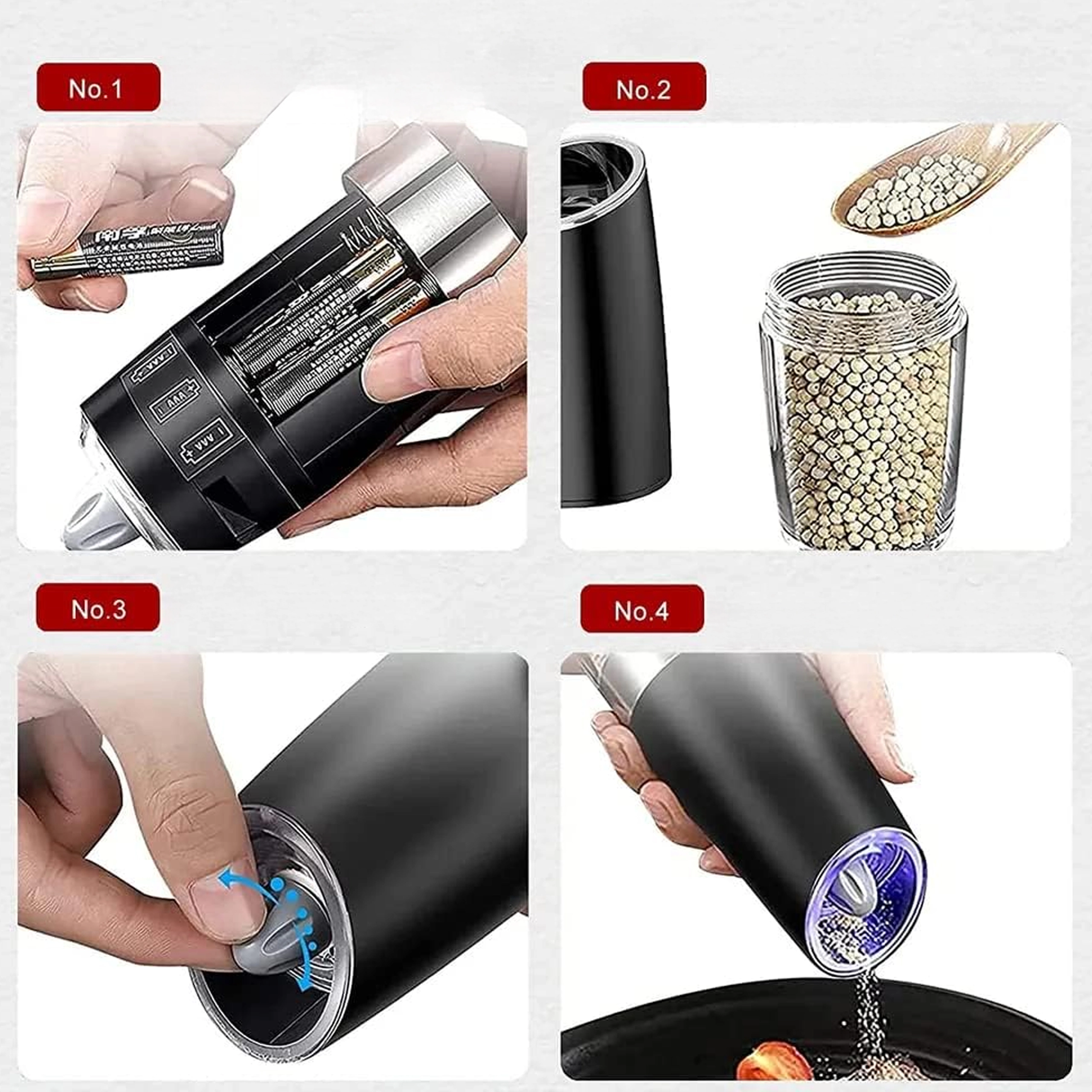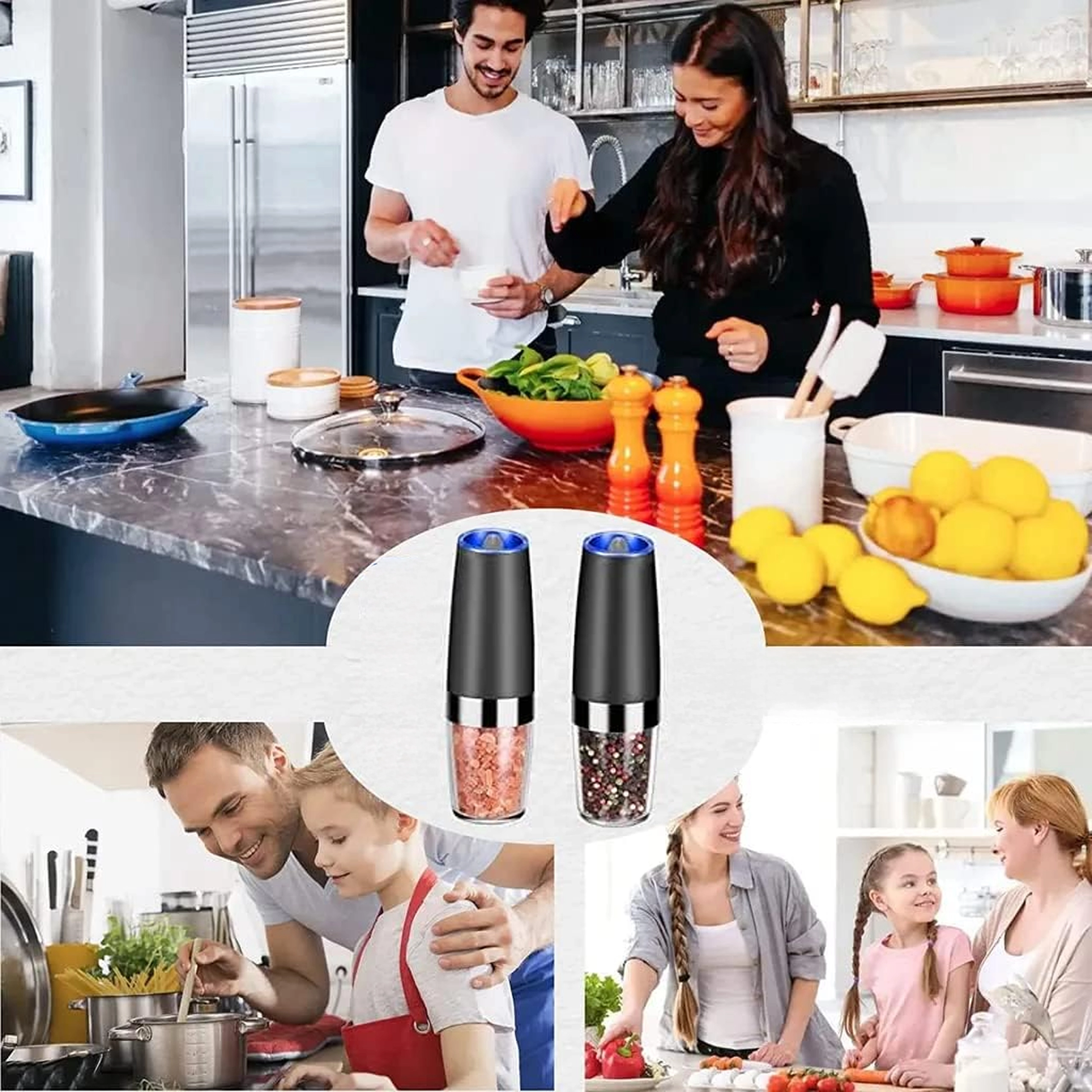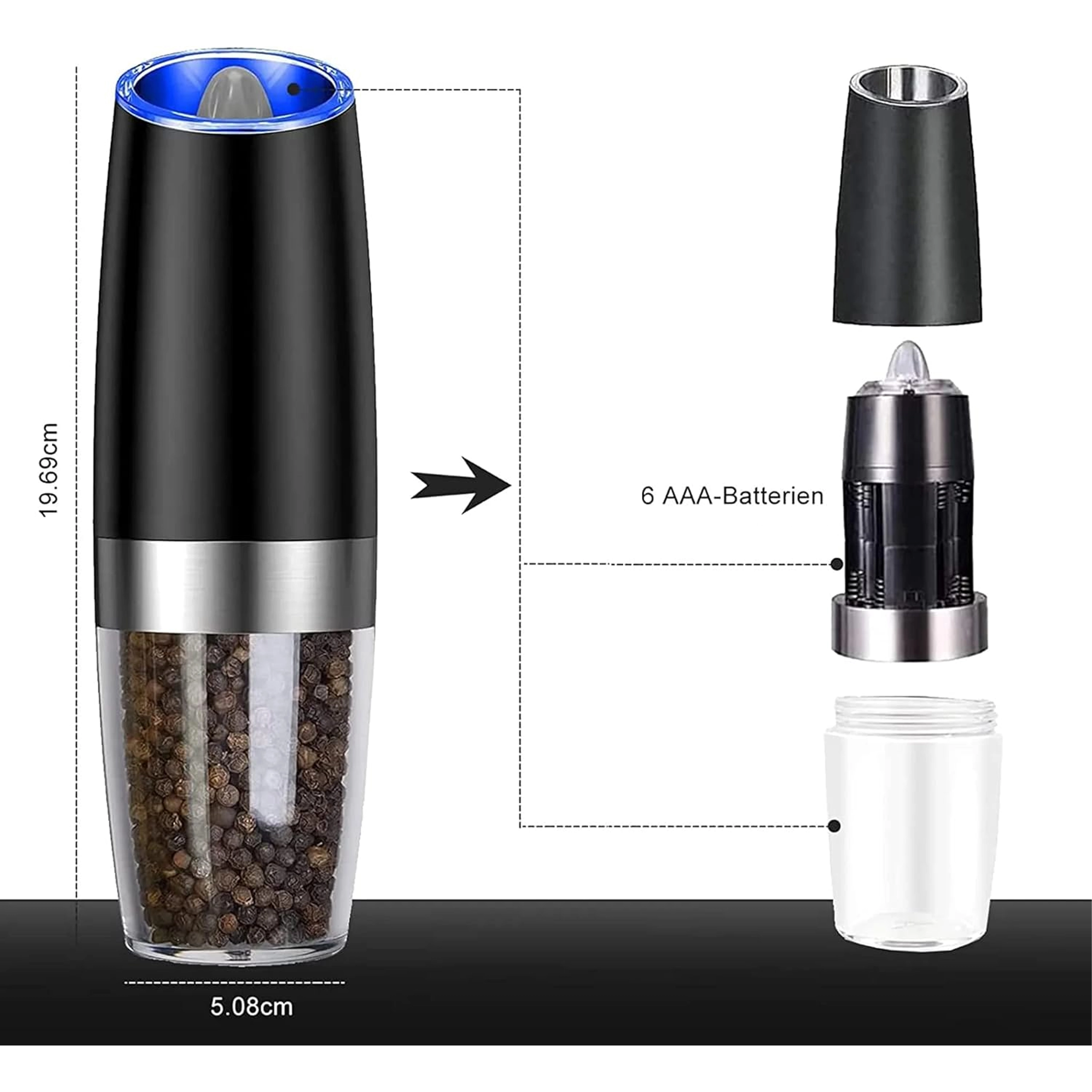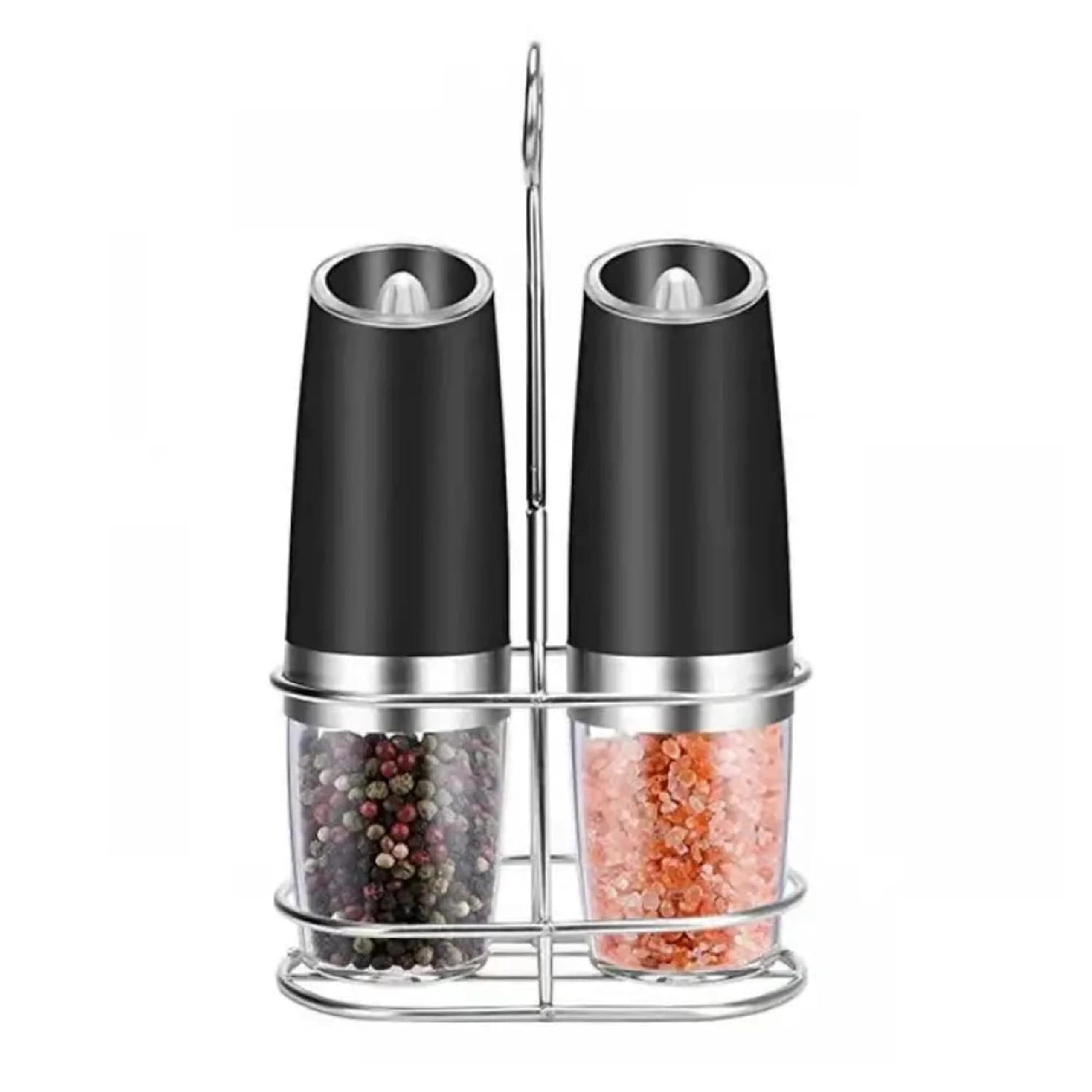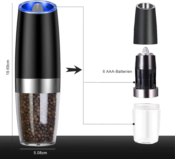 Découvrez le confort de l’assaisonnement quotidien avec un set de deux moulins électriques à déclenchement gravitationnel. Il suffit de les incliner pour moudre fraîchement le sel, le poivre ou d’autres épices – sans appuyer sur aucun bouton. Réservoir transparent pour un contrôle facile, réglage de la finesse de mouture et éclairage LED intégré pour un dosage précis font de ces moulins un accessoire à la fois élégant et pratique pour toute cuisine. Mouture automatique, utilisation à une main, lumière LED et design moderne pour le plan de travail.