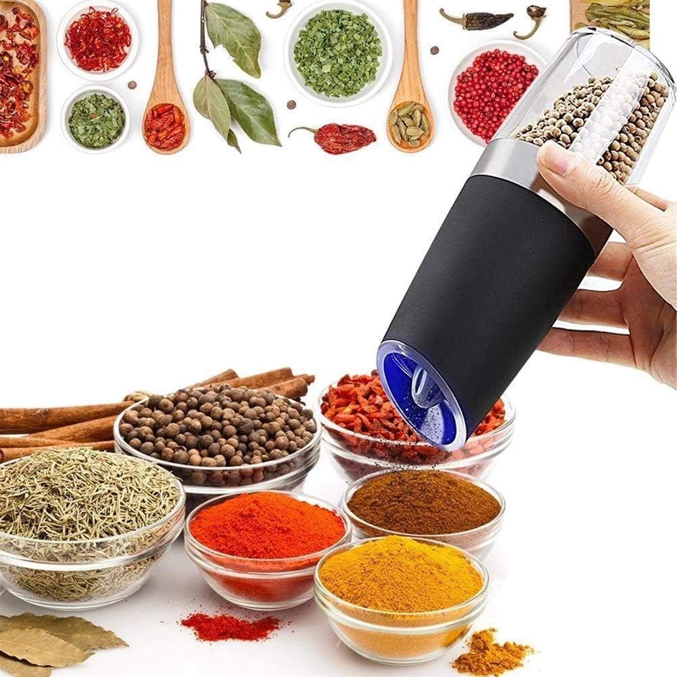 Le set comprend deux moulins électriques avec activation gravitationnelle – les épices commencent à être moulues automatiquement lorsque vous les inclinez au-dessus du plat. Grâce au réservoir transparent, vous gardez toujours un œil sur le niveau des ingrédients, et la finesse réglable vous permet de passer aisément d’une poudre fine à des grains plus grossiers.