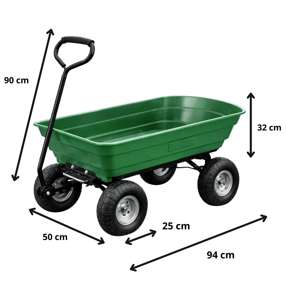 Pratique chariot de jardin avec une capacité de charge jusqu’à 120 kg pour faciliter le transport de terre, d’outils, d’engrais, de bois et de déchets verts. Quatre roues pneumatiques en caoutchouc assurent stabilité et conduite fluide sur l’herbe, le gravier et le sable. La benne amovible et basculante accélère le chargement et le déchargement, tandis que l’anneau d’attelage permet la connexion à un tracteur de jardin ou une tondeuse autoportée. Un assistant idéal pour les travaux quotidiens au jardin et autour de la maison.
