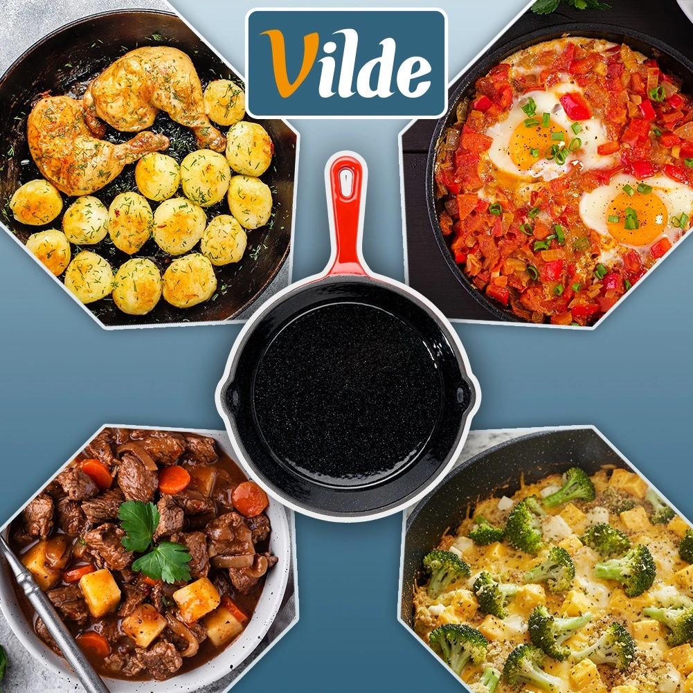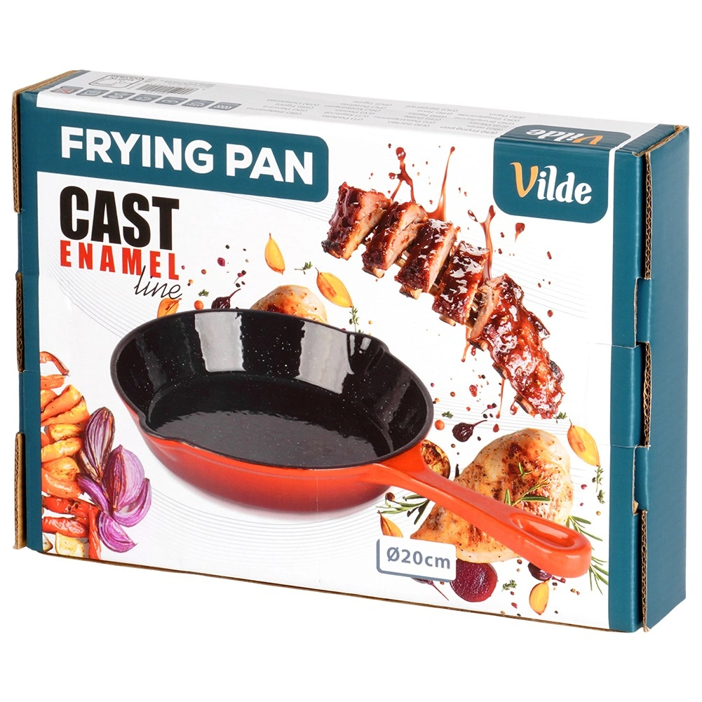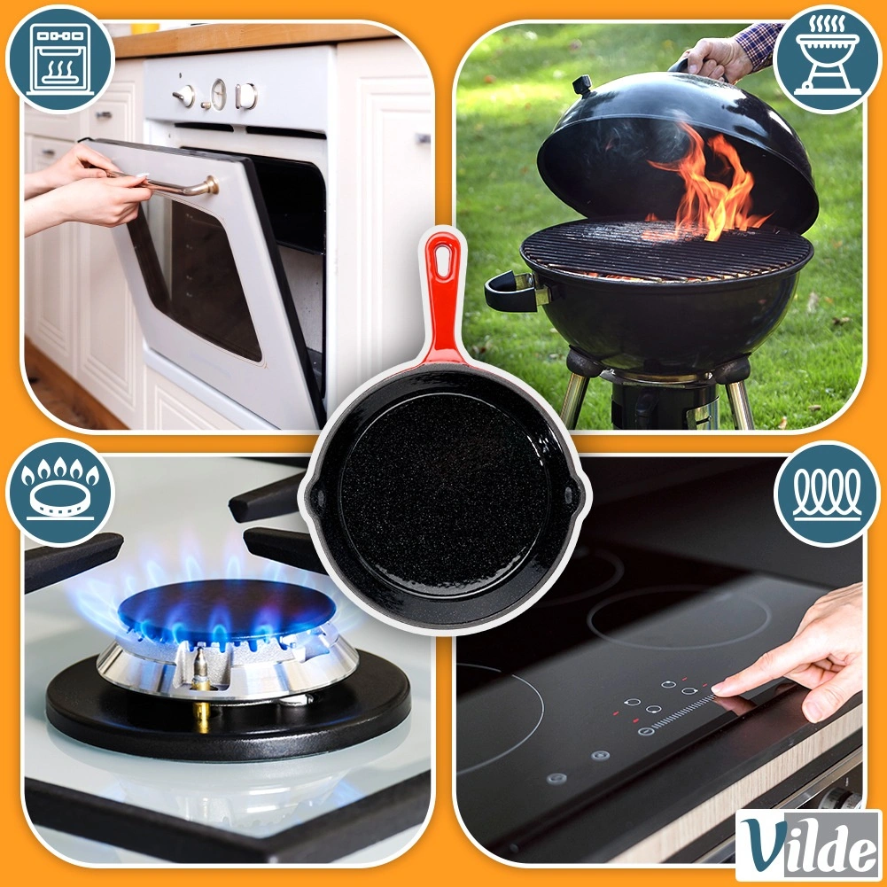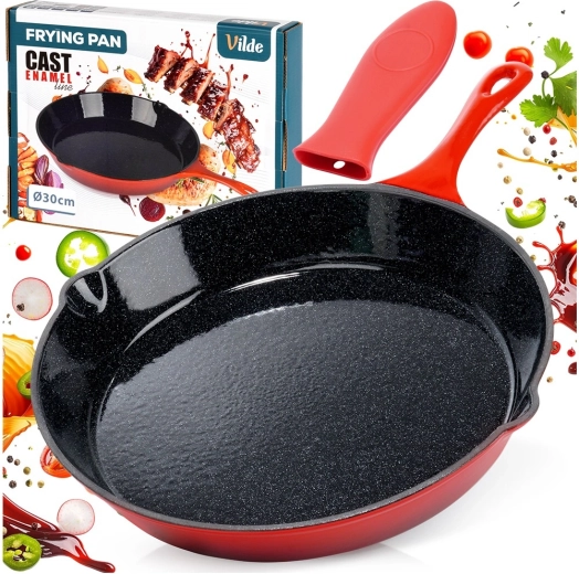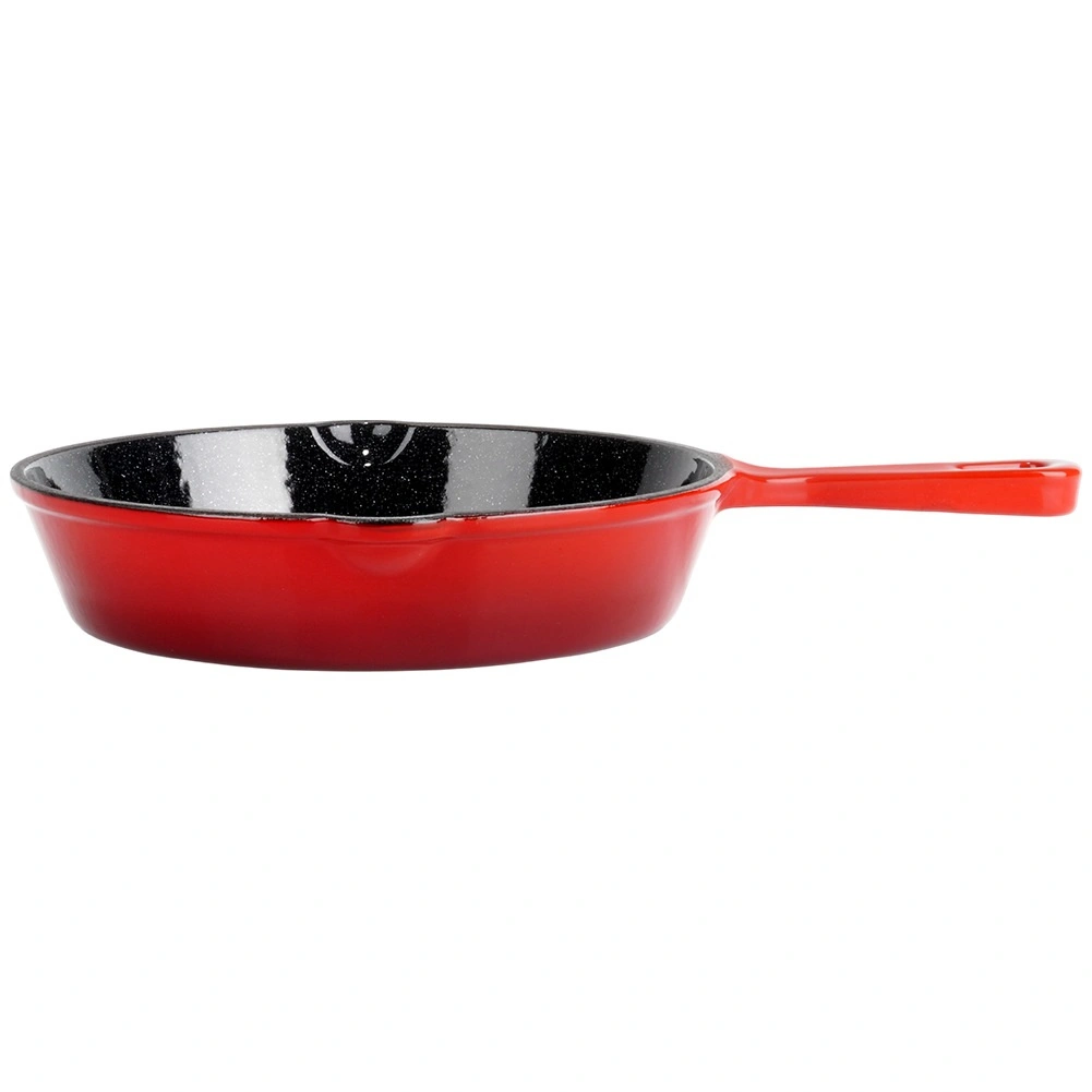 Poêle universelle en fonte de 20 cm de diamètre avec surface intérieure émaillée noire et extérieur rouge, offrant un chauffage rapide et uniforme, une excellente rétention de la chaleur et deux becs verseurs pratiques pour un égouttage facile. Livrée avec un manchon en silicone pour la poignée afin d’assurer une manipulation sûre. Compatible avec gaz, électricité, vitrocéramique et induction et four.