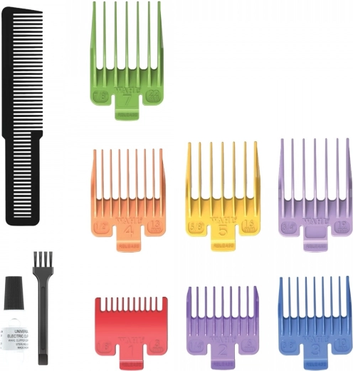 La levier de réglage à trois positions (0,8 mm, 1,5 mm, 1,8 mm) et les 7 sabots colorés (3, 6, 10, 13, 16, 19, 22 mm) garantissent la longueur souhaitée. Son moteur puissant à haut régime rend la tondeuse idéale pour le pelage court et lisse et pour les retouches délicates sur poil mi-long.
