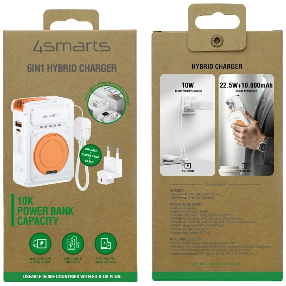 - 6‑en‑1 : chargeur secteur, powerbank 10 000 mAh, socle Qi sans fil, sorties USB‑C/USB‑A, support, câble USB‑C inclus