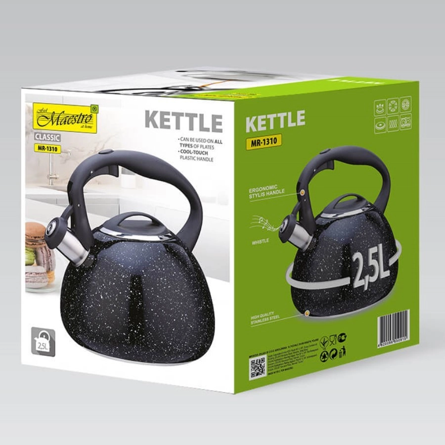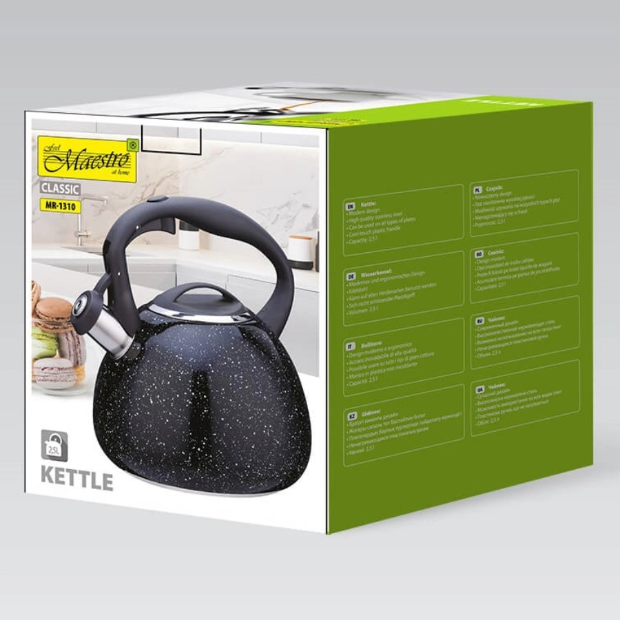 Vous recherchez une bouilloire pour cuisinière fiable et élégante ? La bouilloire MAESTRO 2,5 l en acier inoxydable allie design moderne et fonctionnalités pratiques. Sa large base assure stabilité et transfert de chaleur efficace, tandis que le couvercle siffleur sur le bec vous avertit lorsque l’eau est prête. Grâce au couvercle amovible, le remplissage comme l’entretien sont particulièrement aisés.