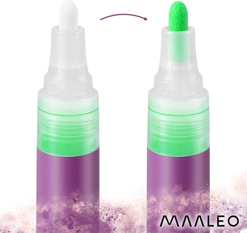 Les marqueurs acryliques MAALEO allient la praticité d’un feutre à l’effet d’une véritable peinture acrylique. Ils permettent de réaliser aisément des aplats intenses, des contours contrastés et de fins détails, sans pinceaux ni désordre. Idéals pour le papier, le bois, le plastique, le textile, le verre, le métal, la pierre et la céramique – la peinture ne traverse pas et, une fois sèche, est résistante à l’eau et à l’abrasion.