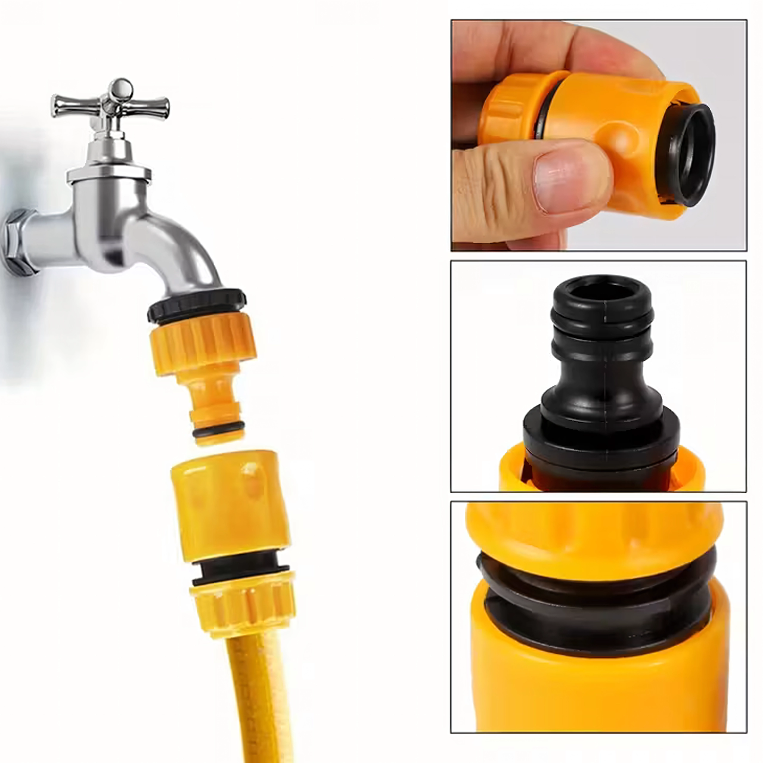Les prises moletées facilitent le serrage même avec les mains mouillées, tandis que les joints toriques en caoutchouc assurent l’étanchéité et minimisent les fuites d’eau. La construction en plastique durable est légère, facile à entretenir et idéale pour l’arrosage quotidien du jardin, le lavage de la voiture et d’autres travaux extérieurs.