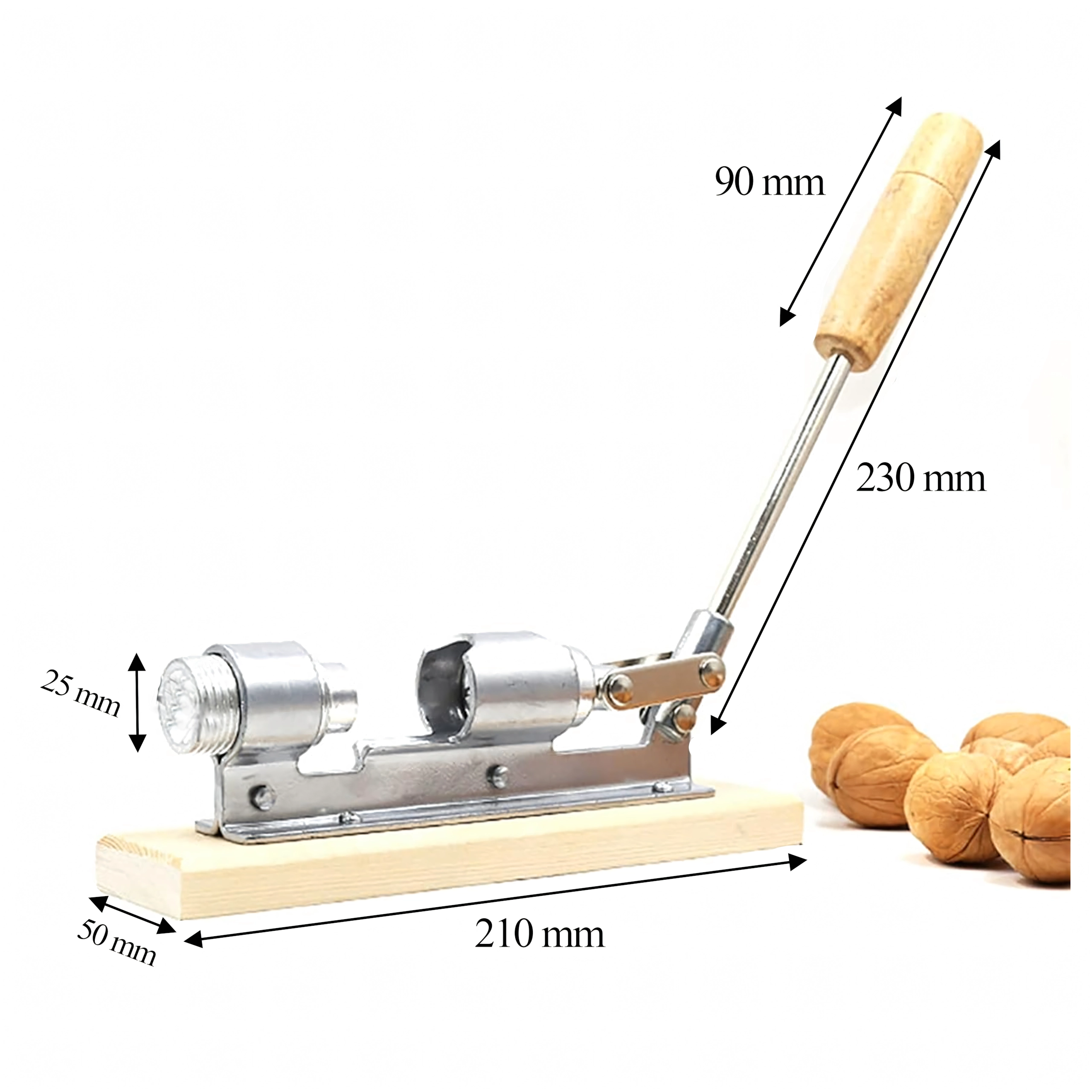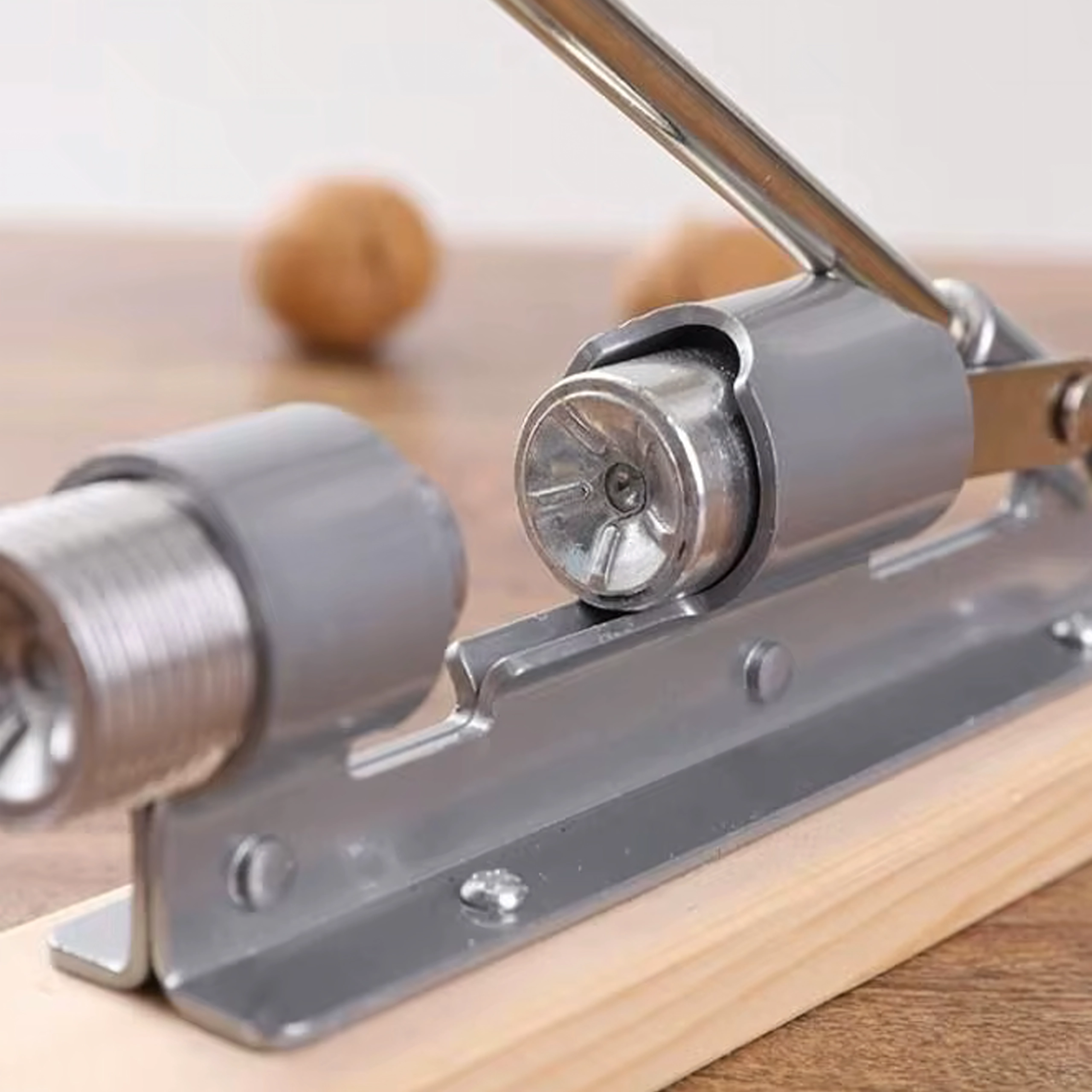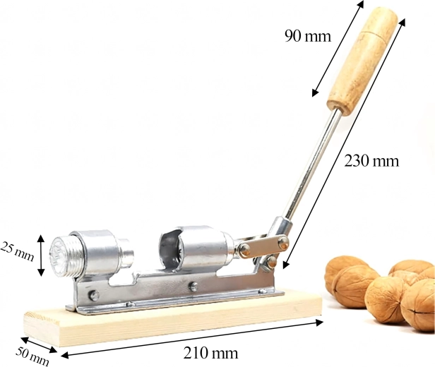 Le long bras de levier avec poignée en bois multiplie la force de serrage et permet de casser facilement même les coquilles dures sans solliciter les poignets.