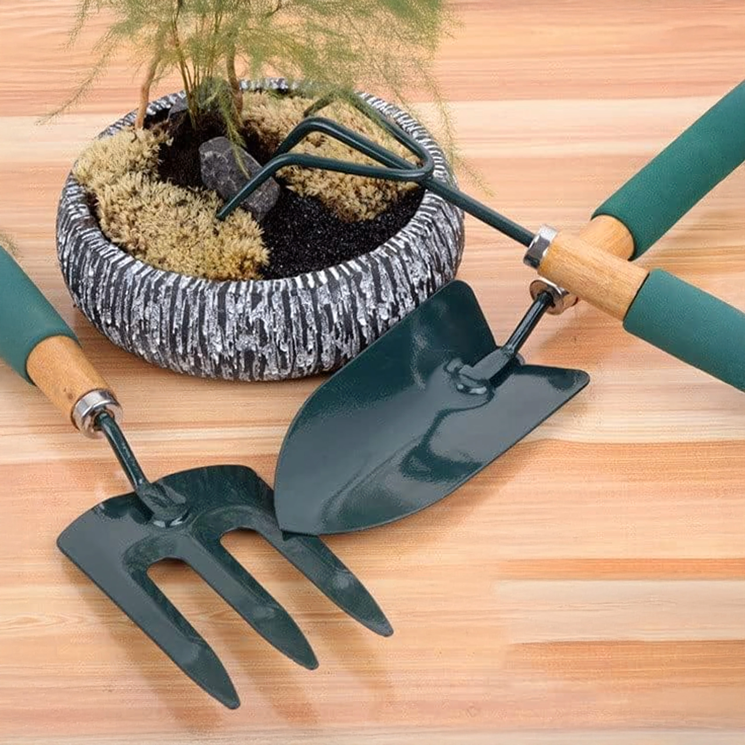 Ensemble pratique de trois outils manuels pour l’entretien des plates-bandes et des jardinières – pelle, cultivateur/mini râteau et fourche de jardin. Des têtes de travail en métal résistantes et des poignées ergonomiques antidérapantes assurent un travail confortable pour le bêchage, l’ameublissement du sol et le rempotage.