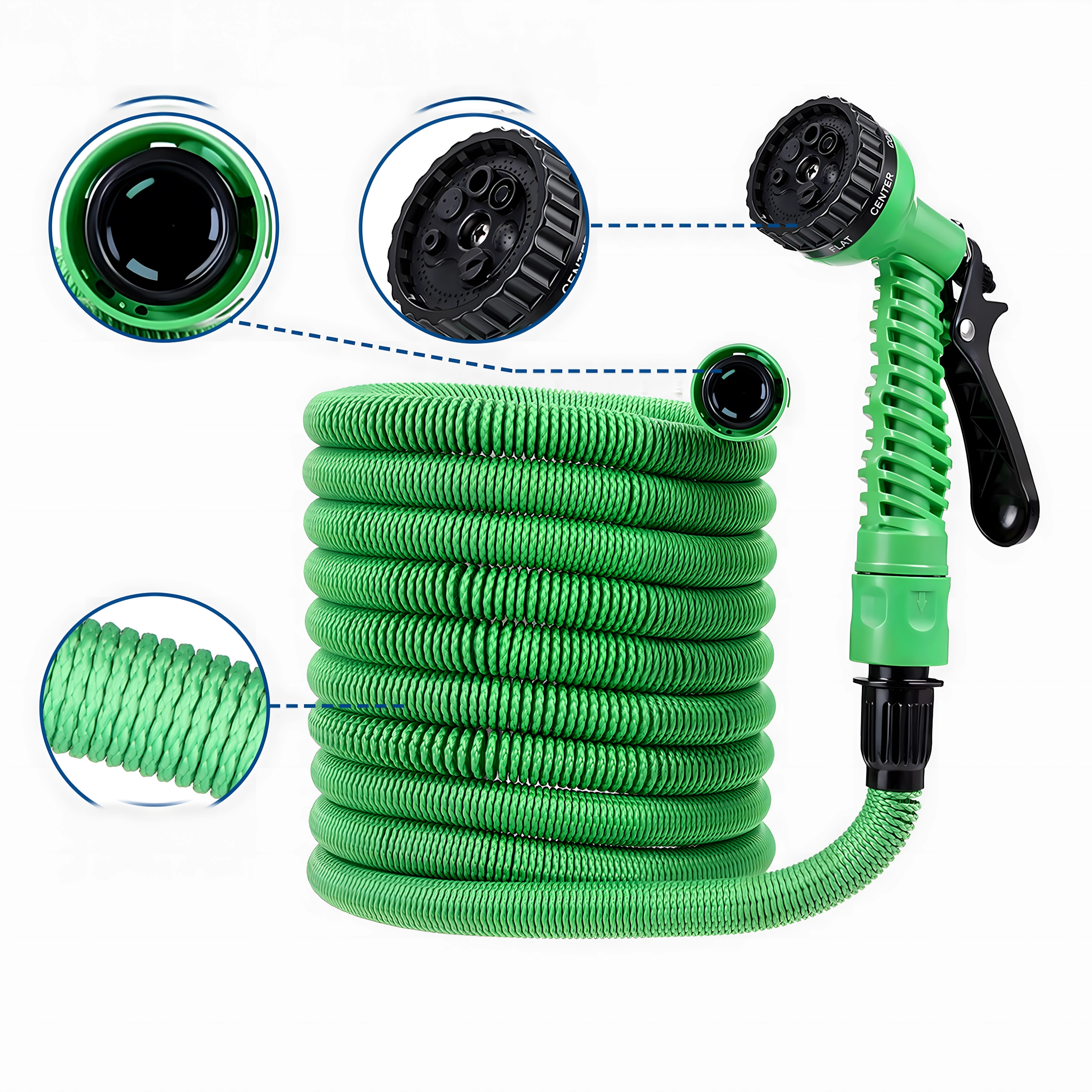 Profitez d’un arrosage confortable grâce à un tuyau qui s’allonge automatiquement jusqu’à trois fois sa longueur sous la pression de l’eau et se rétracte rapidement après vidange. La surface tissée résistante aide à prévenir l’abrasion et les pliures, tandis que le pistolet ergonomique à multiples modes vous permet d’adapter le débit, de la fine brume au jet puissant.
