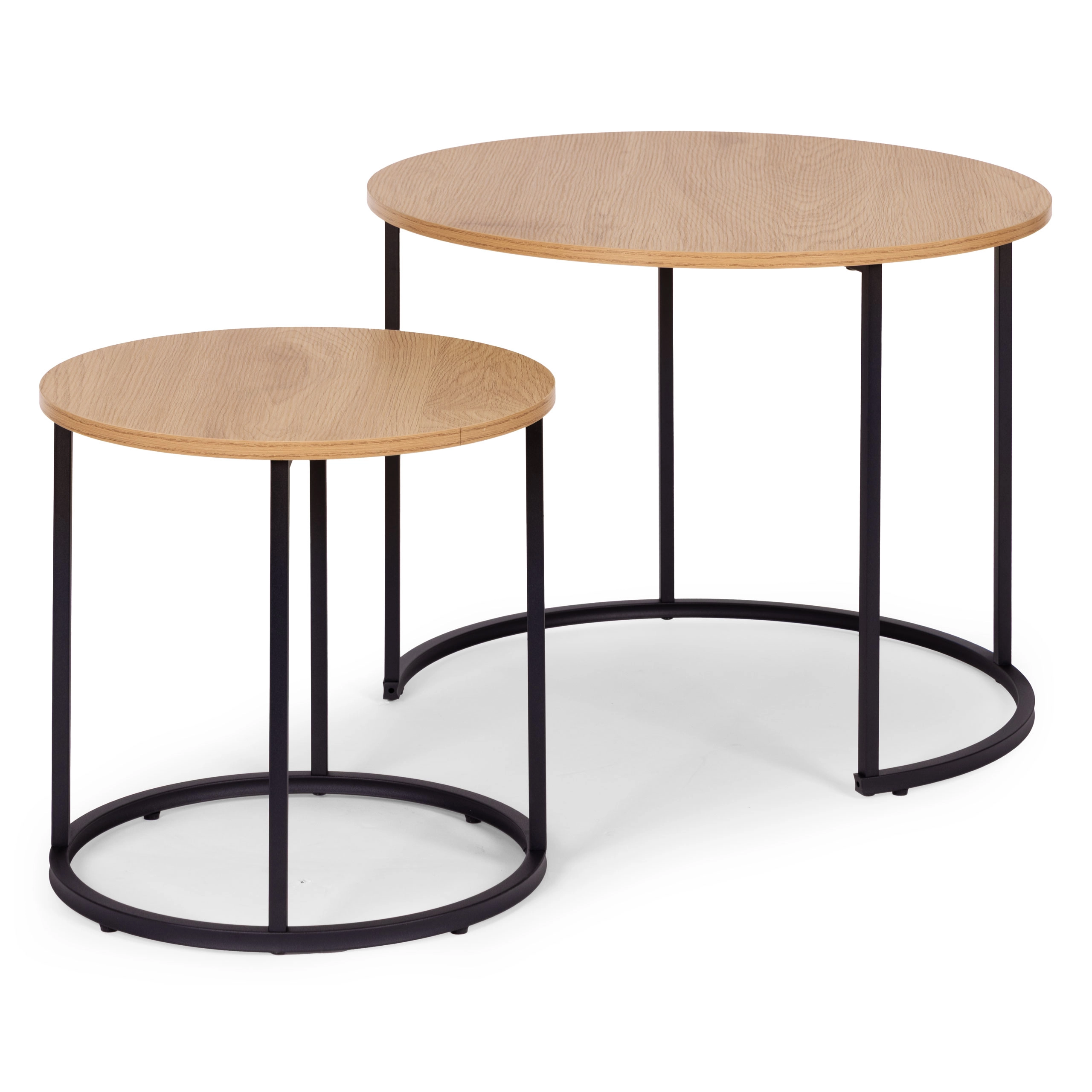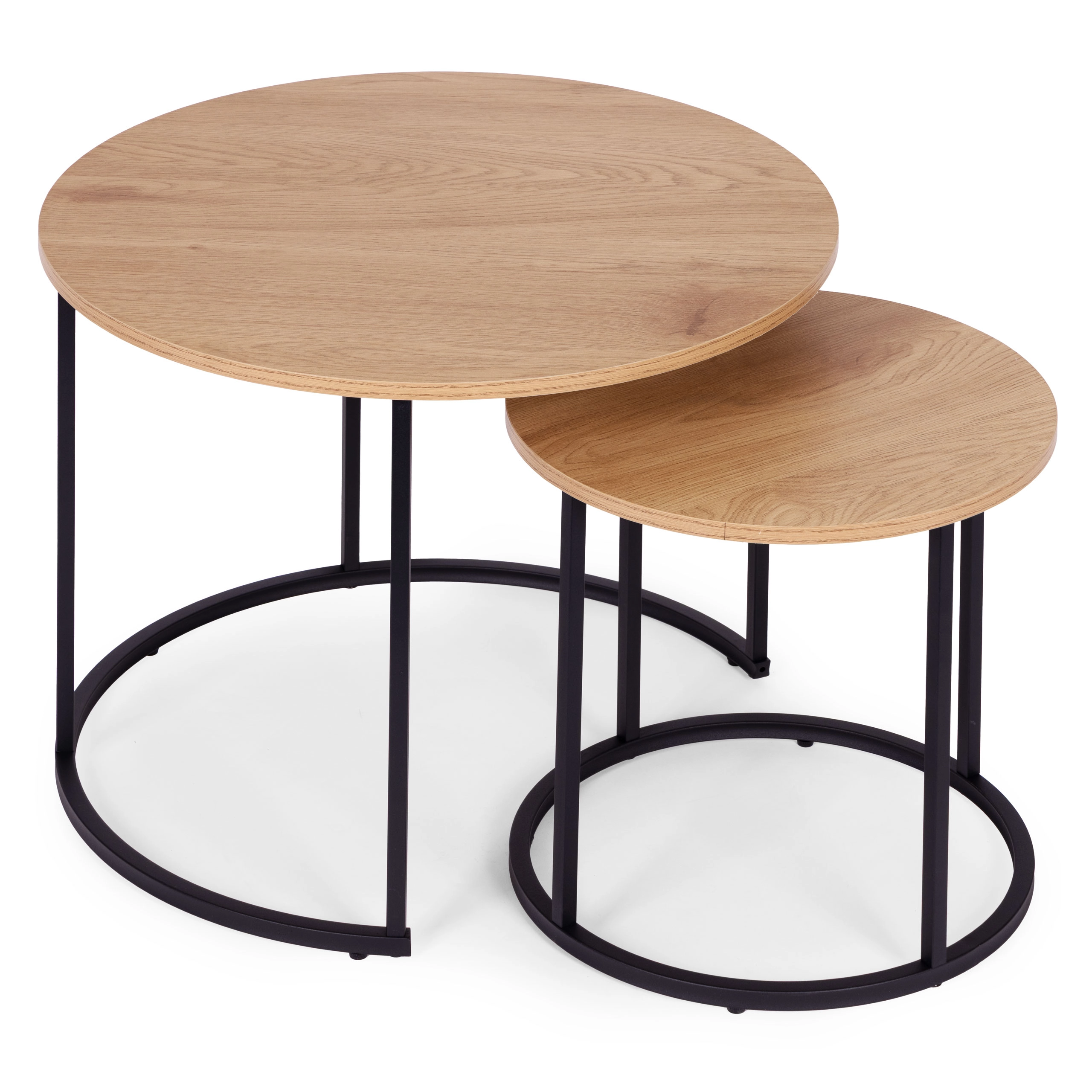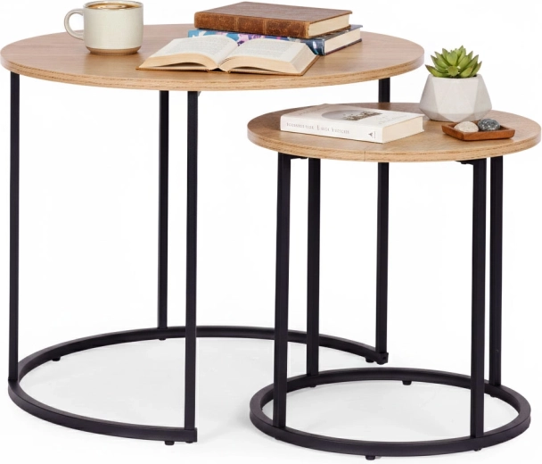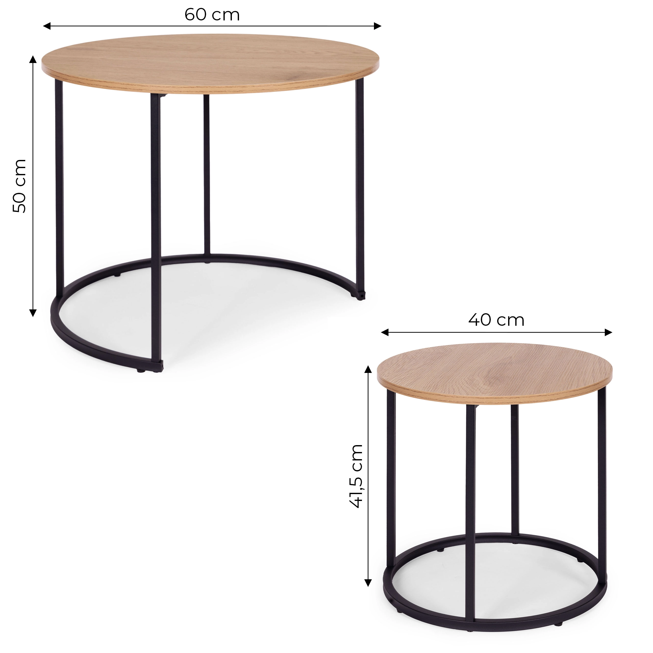 Élégant ensemble de deux tables rondes au style loft alliant chêne clair et métal noir pour un look moderne. Il offre un emboîtement pratique pour gagner de la place, une structure stable avec revêtement par poudre et des plateaux durables en MDF laminé avec des patins antidérapants pour une tenue sûre sur tout type de sol.