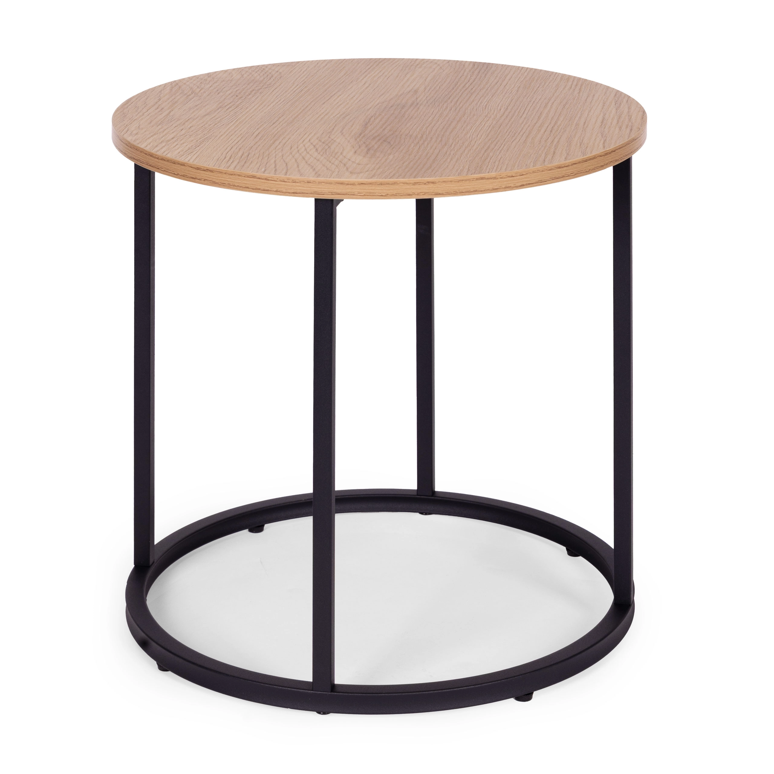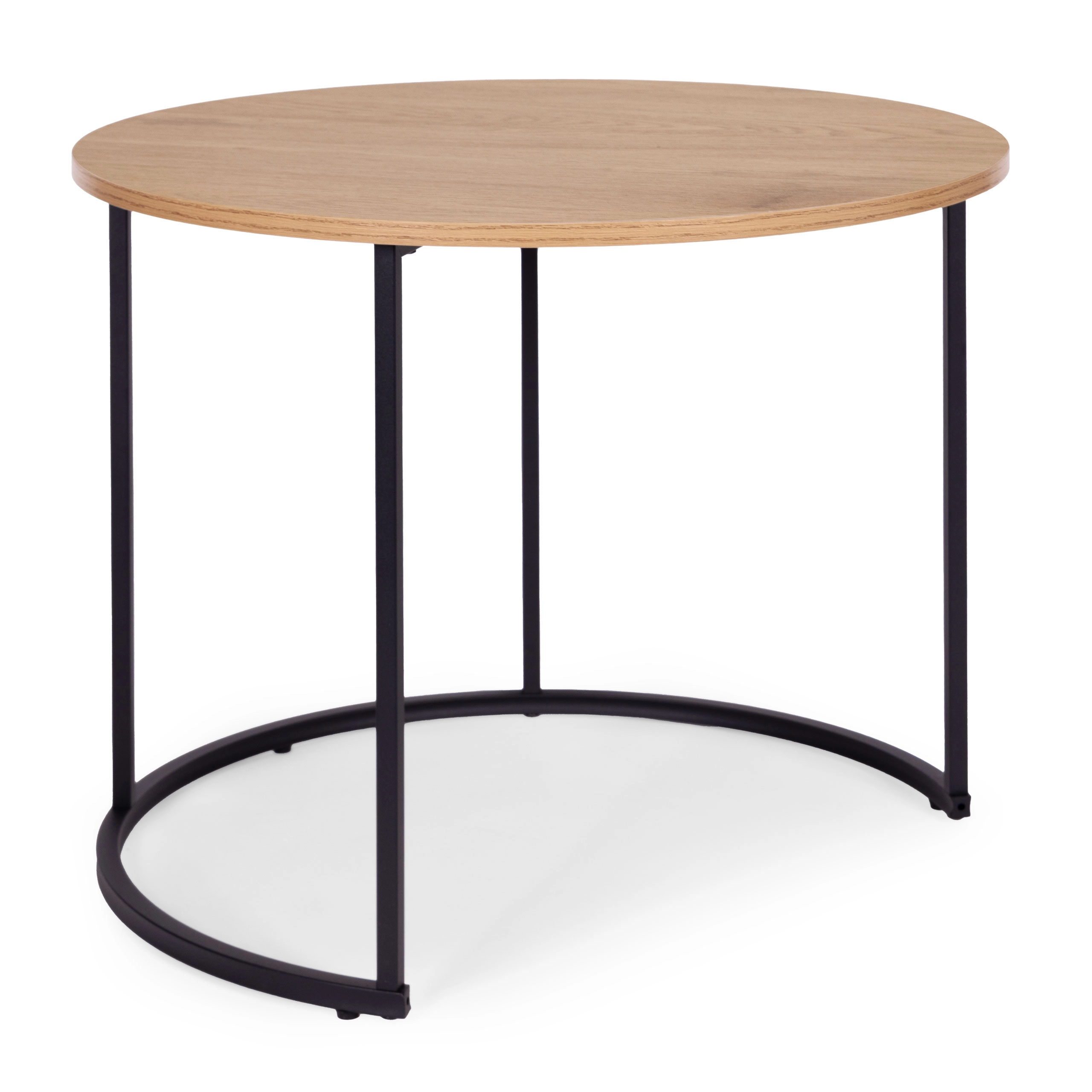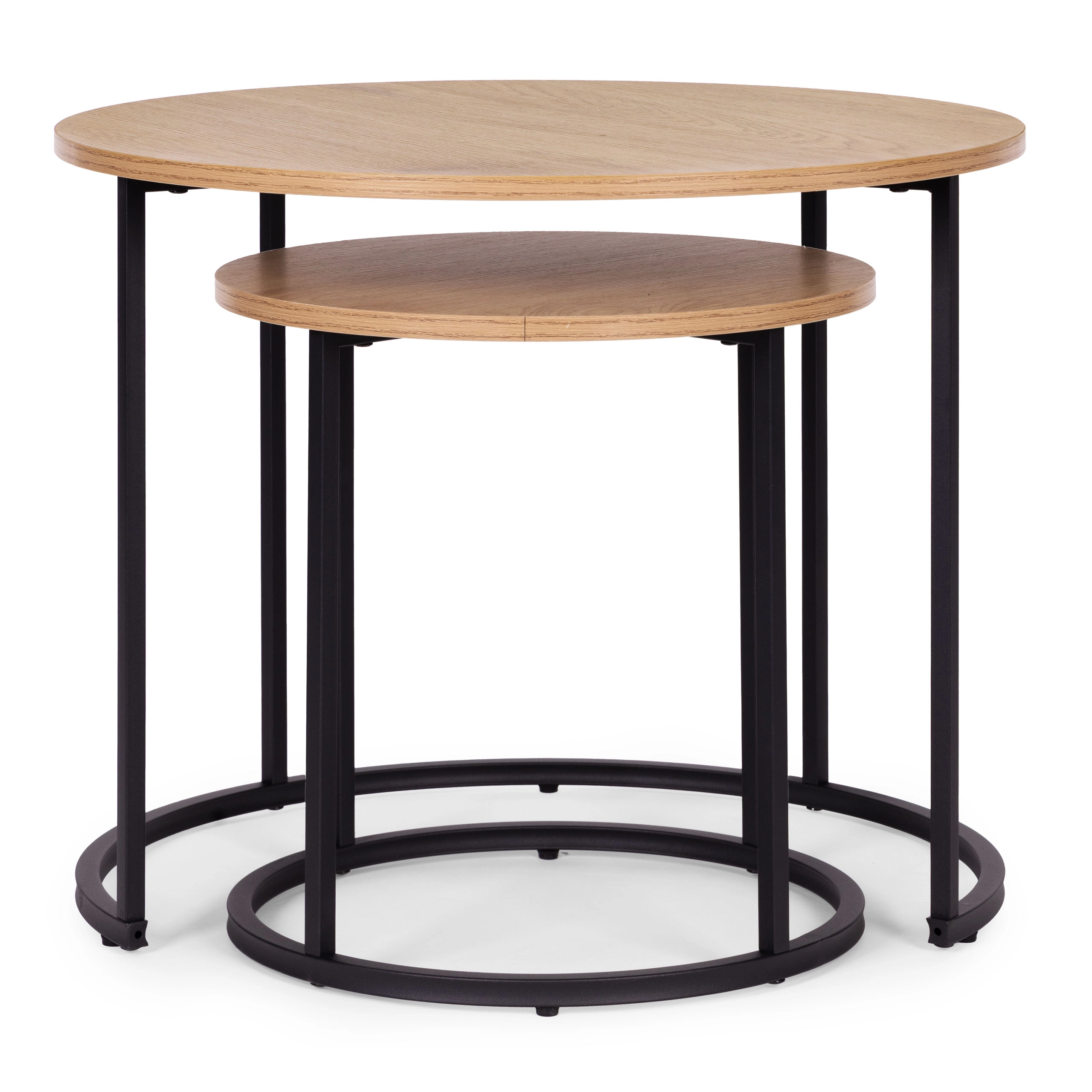 Élégant ensemble de deux tables rondes au style loft alliant chêne clair et métal noir pour un look moderne. Il offre un emboîtement pratique pour gagner de la place, une structure stable avec revêtement par poudre et des plateaux durables en MDF laminé avec des patins antidérapants pour une tenue sûre sur tout type de sol.
