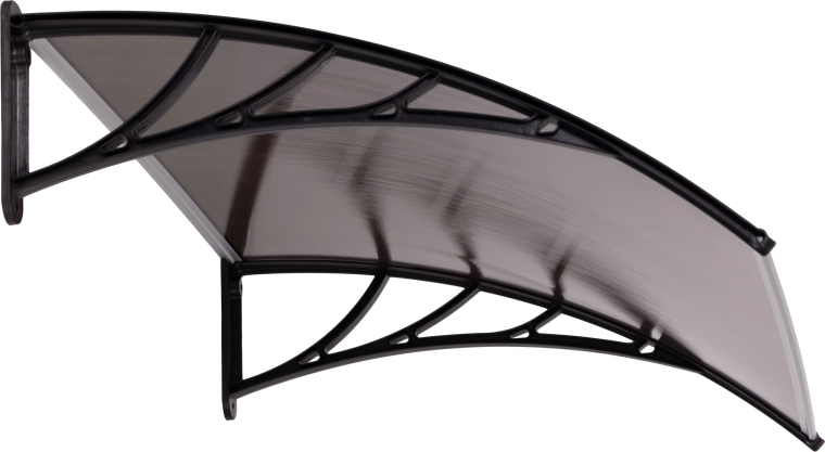 Les consoles latérales en plastique et le polycarbonate alvéolaire de 5 mm assurent la rigidité. La forme profilée favorise l’évacuation de l’eau et de la neige sans charge excessive.