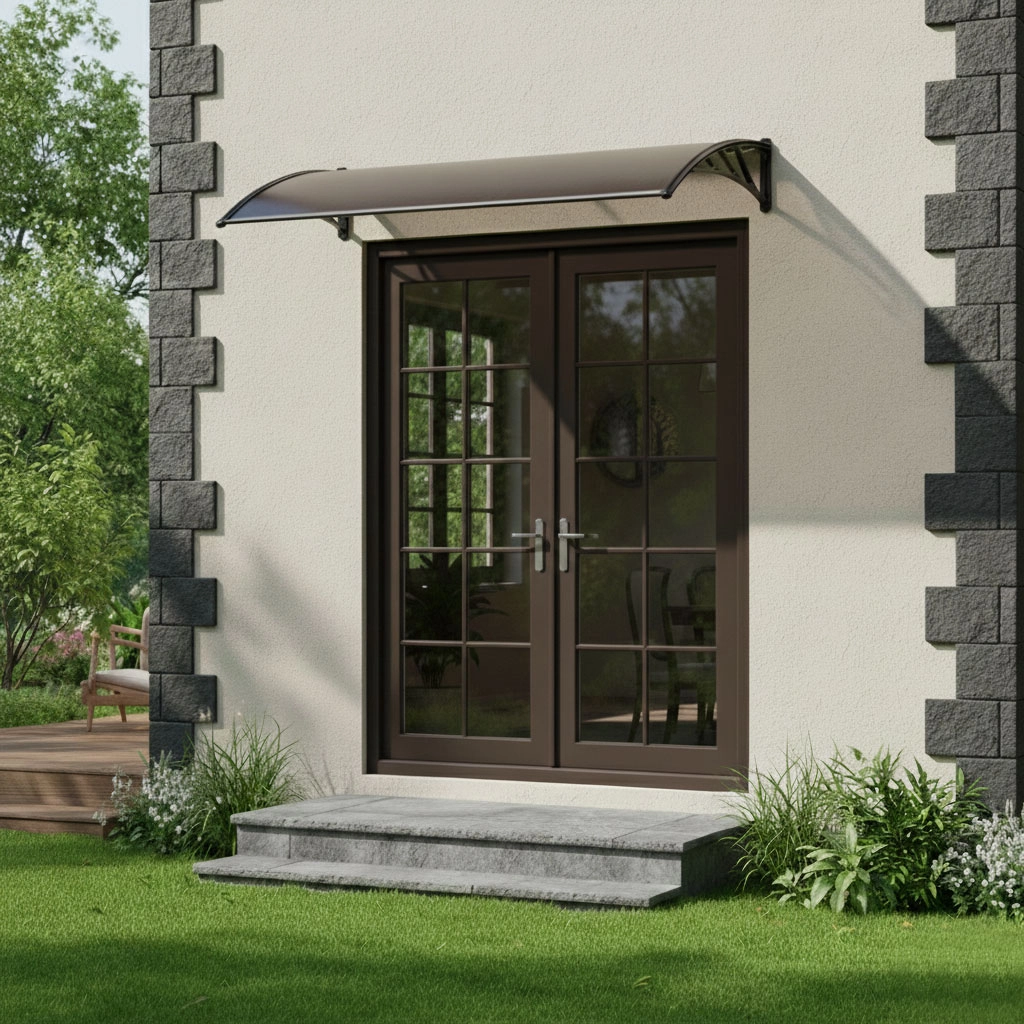 La marquise cintrée et translucide couvre la porte et ses abords, laisse passer la lumière du jour tout en protégeant des précipitations et des UV. Adaptée aux maisons comme aux locaux professionnels.