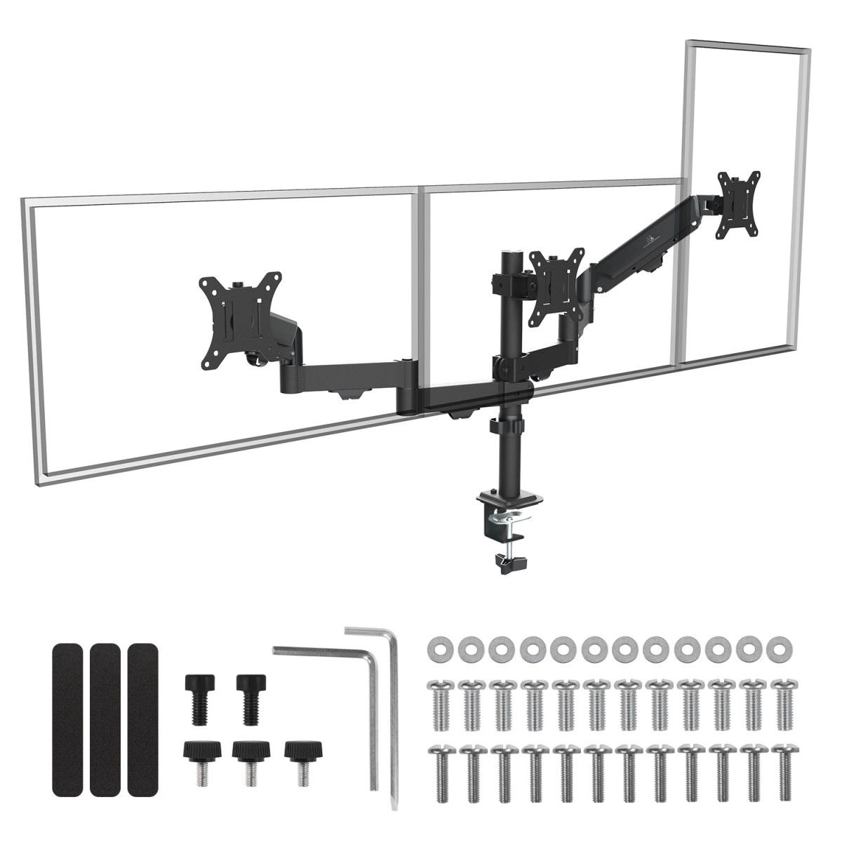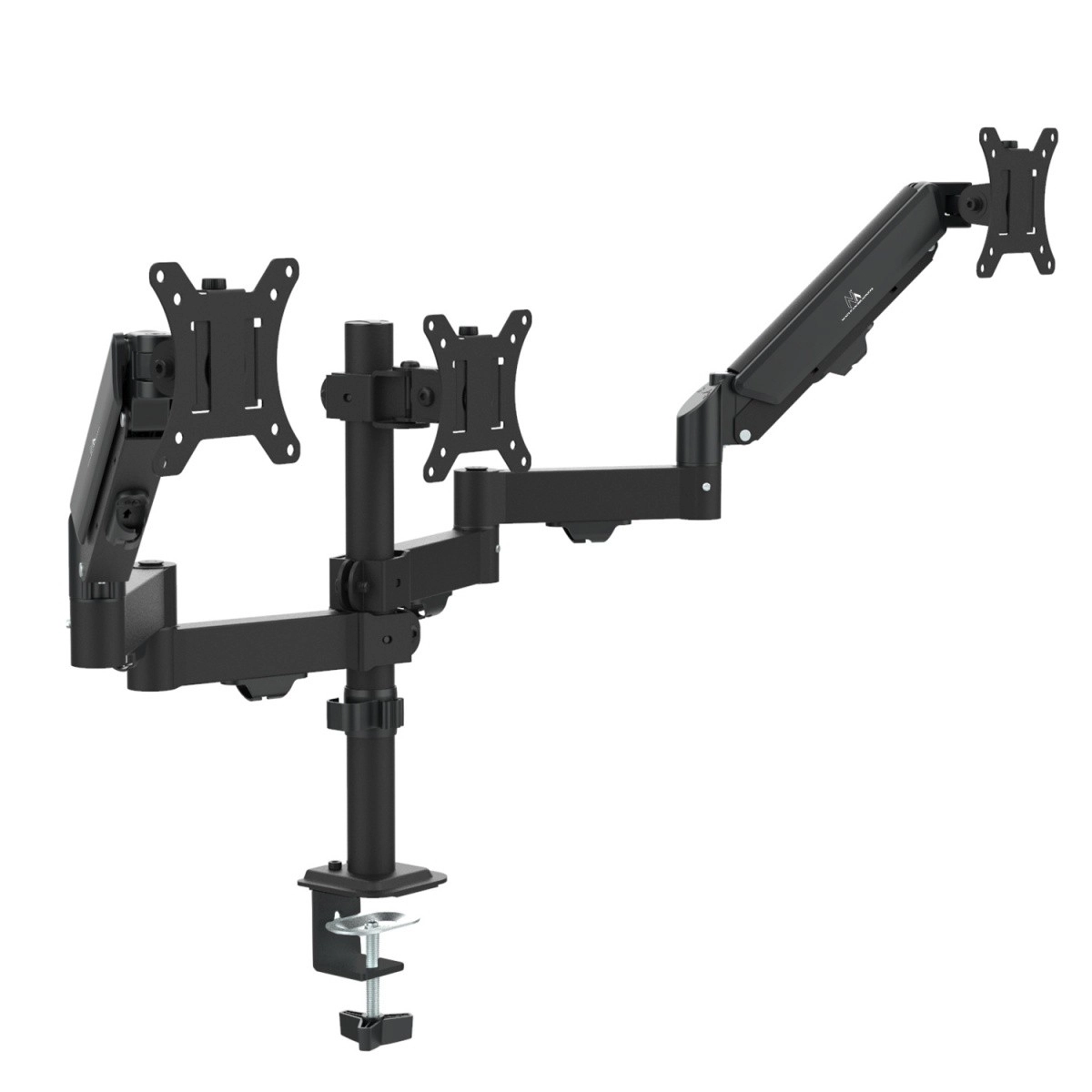 Les deux bras latéraux à vérins à gaz permettent un positionnement de la hauteur facile et précis, y compris l’inclinaison et la rotation pour un angle de vue parfait. Le moniteur central est fixé directement au mât central, garantissant une base solide et une ligne uniforme des trois écrans. Grâce au montage VESA et à une conception bien pensée, vous obtenez facilement un réglage ergonomique et un bureau dégagé.