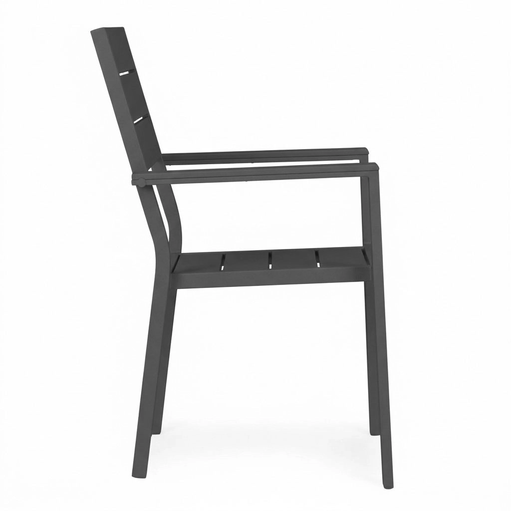 La structure en acier peint par poudrage est robuste et résistante à la corrosion, tandis que l’assise et le dossier en HDPE assurent confort, nettoyage facile et évacuation rapide de l’eau après la pluie. Une base stable, une assise large et des accoudoirs droits favorisent une assise agréable même lors d’une utilisation prolongée.
