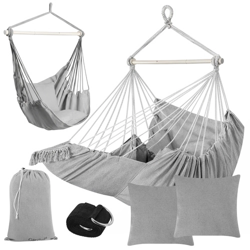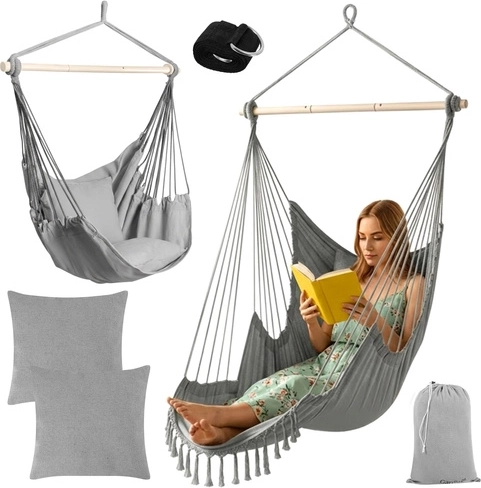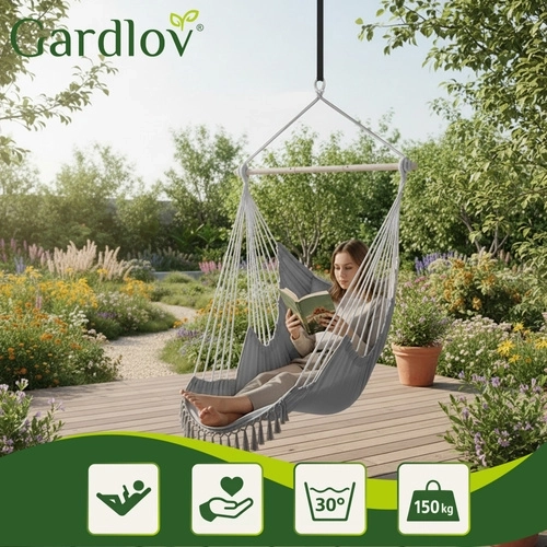 Profitez d’une détente paisible à la maison comme en plein air avec le fauteuil hamac suspendu GARDLOV au style soigné. Le tissu résistant, la barre de stabilisation et une capacité de charge de 150 kg assurent un balancement sûr et confortable. Le colis inclut 2 coussins moelleux, une sangle de suspension et une housse pratique pour un transport facile. Idéal pour le balcon, la terrasse, le jardin et le salon.