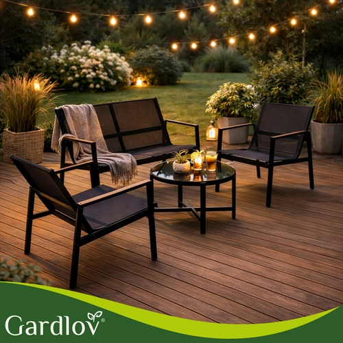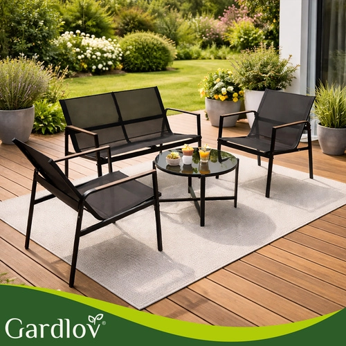 Créez en un instant une zone conviviale sur votre balcon ou terrasse. Ensemble GARDLOV 4 en 1 comprenant un canapé, deux fauteuils et une table basse avec plateau en verre trempé. Grâce à la structure en acier (galvanisé) et au tissu respirant Teslin, l’ensemble est stable, résistant aux intempéries et facile à entretenir – il suffit d’essuyer avec un chiffon humide.