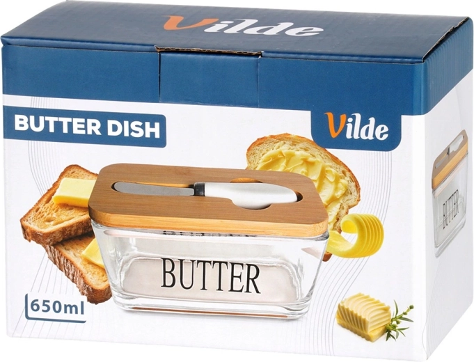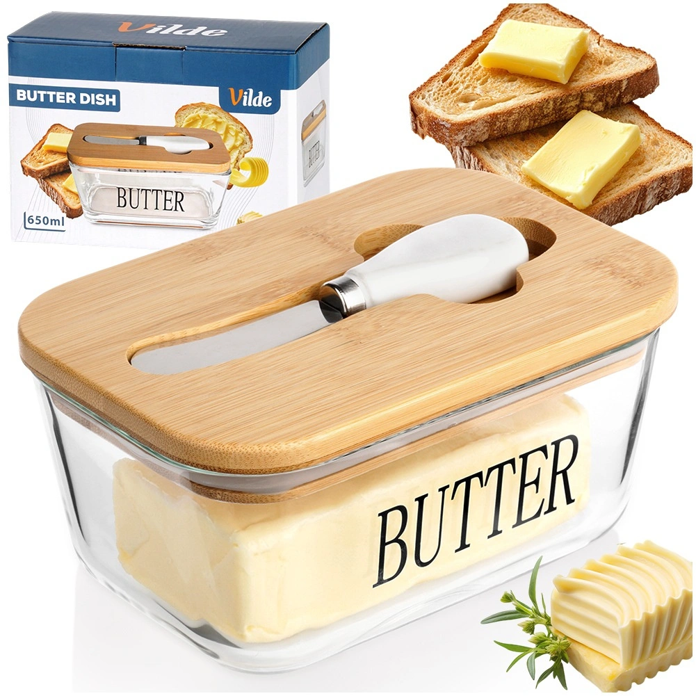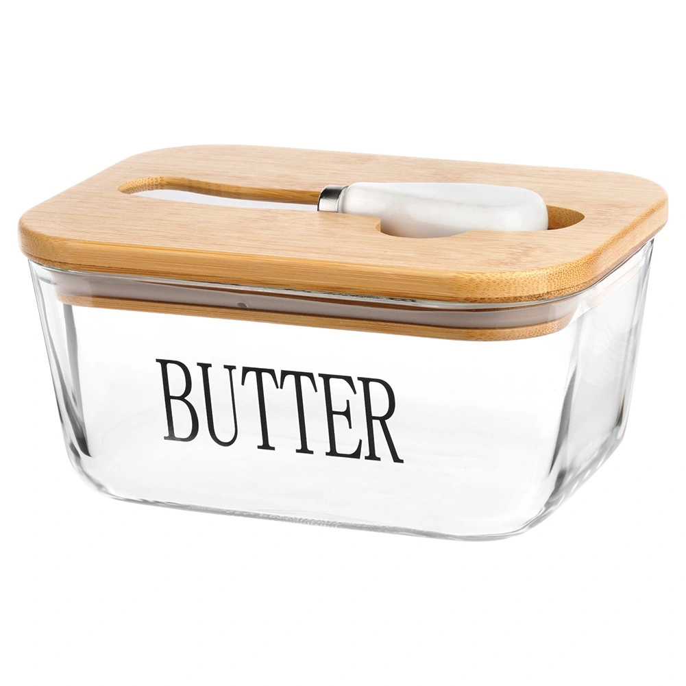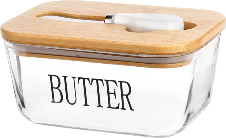Beurrier élégant en verre avec couvercle en bambou et couteau à beurre intégré pour un rangement et un service pratiques. Verre transparent avec inscription BUTTER, capacité de 650 ml, dimensions 16,5 × 11,5 × 8 cm. La partie en verre passe au lave-vaisselle et convient au micro-ondes. Un accessoire stylé pour toute cuisine.