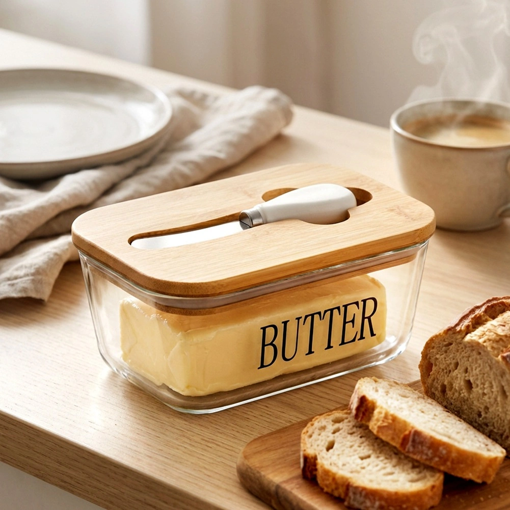 Le verre transparent avec l’inscription BUTTER et le bambou naturel forment un ensemble élégant pour la table comme pour le réfrigérateur. Une forme classique qui s’intègre à toute cuisine.