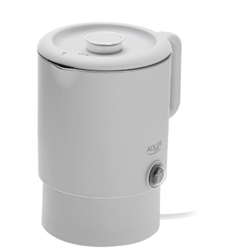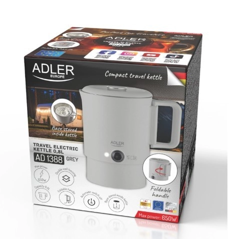 La bouilloire de voyage compacte ADLER AD 1388 d’une capacité de 0,8 l est idéale pour les vacances, les déplacements professionnels et le camping. Grâce à sa poignée rabattable, à la base rangée à l’intérieur de la bouilloire et à la double paroi, elle allie dimensions minimales à une ébullition de l’eau sûre et rapide. Son corps intérieur en acier inoxydable, l’arrêt automatique, la protection contre la chauffe à sec et la base rotative à 360° en font une compagne pratique pour chaque voyage.