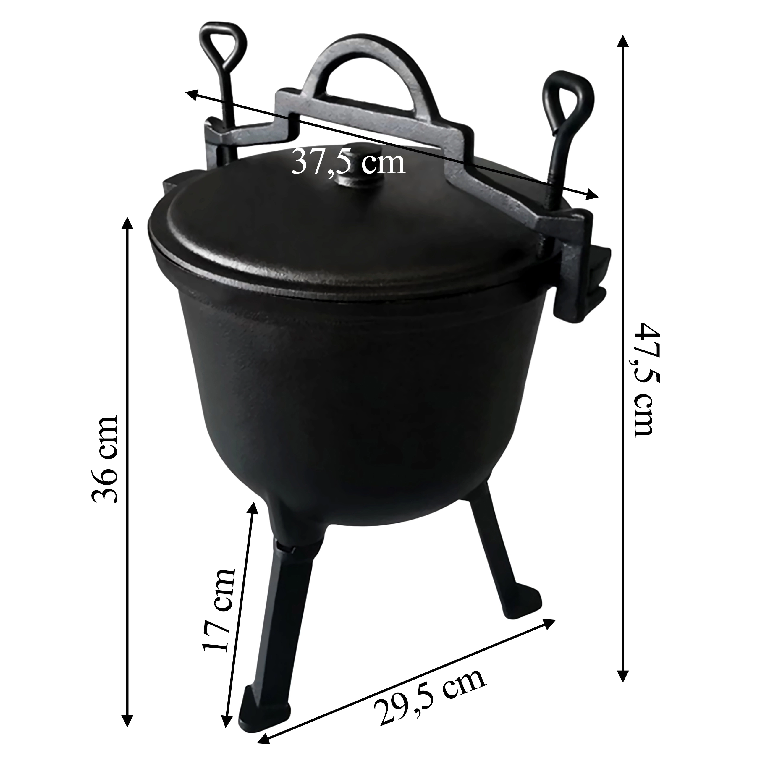 - Chaudron avec couvercle, trépied/pieds intégrés, poignées latérales