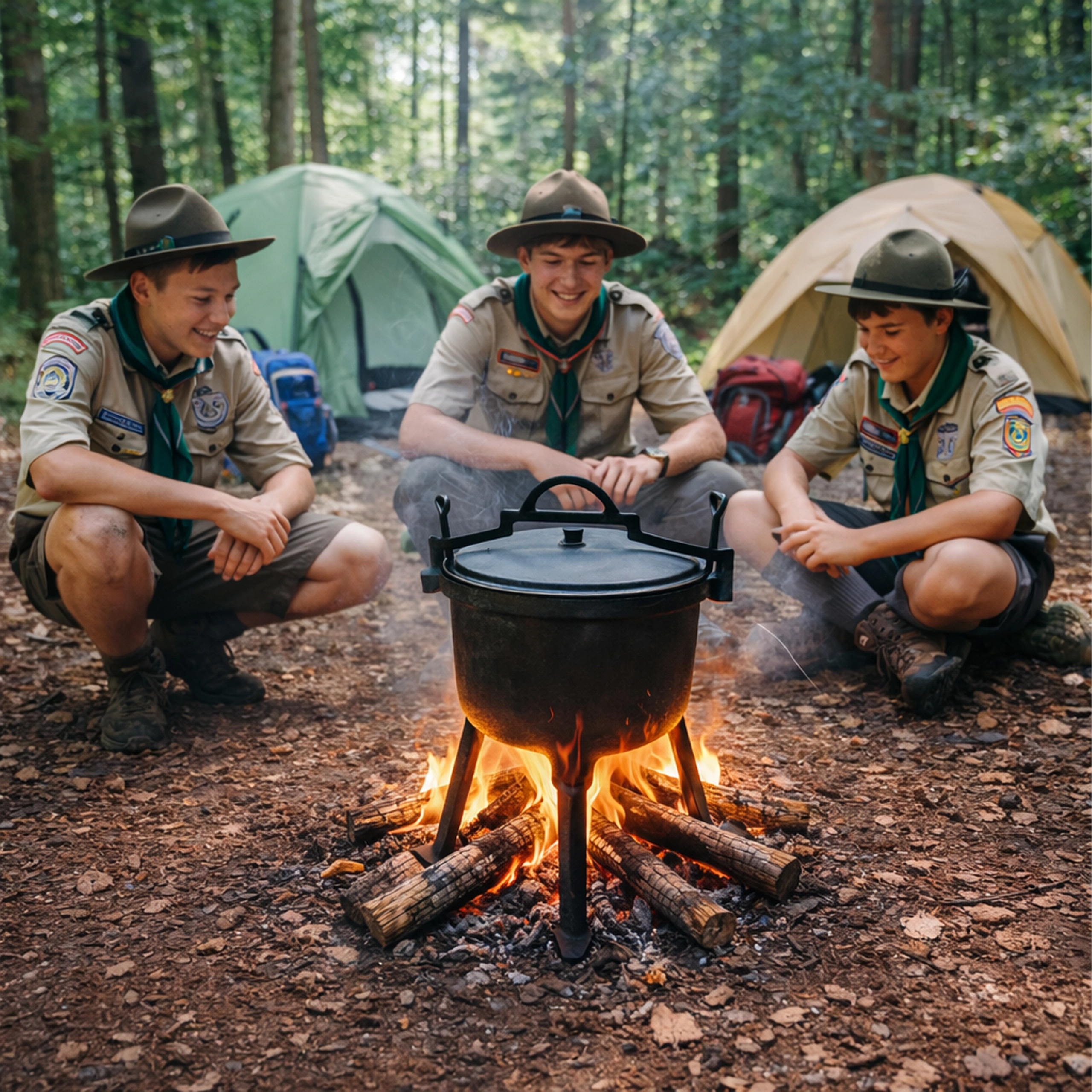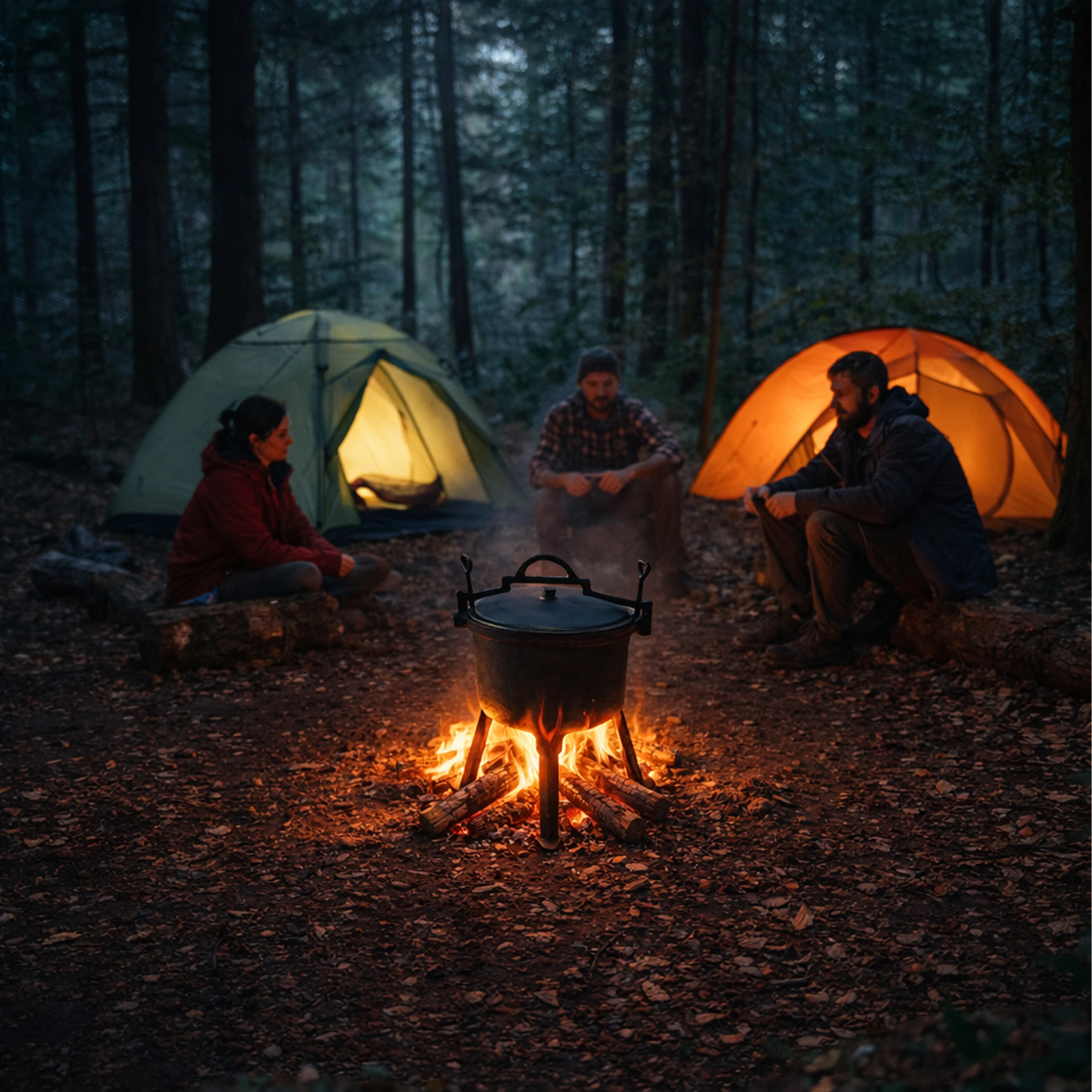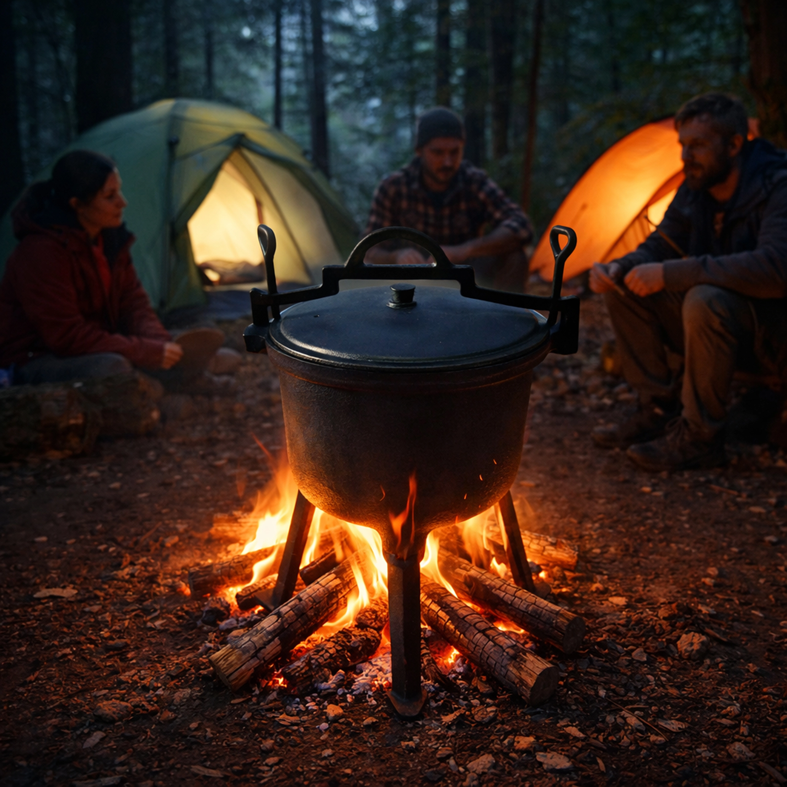Le trépied intégré maintient fermement le chaudron au-dessus des flammes, rendant la cuisson sûre et homogène même en pleine nature.