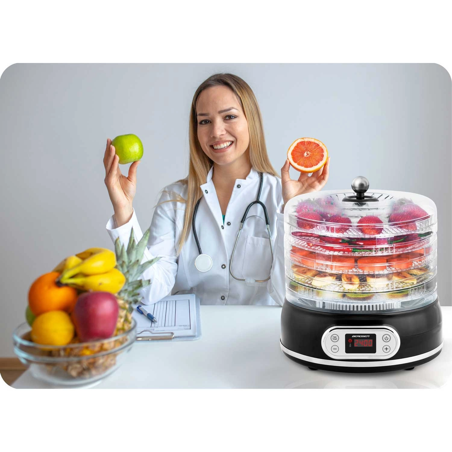 Réalisez des encas sains et savoureux – des anneaux de pomme croustillants aux herbes séchées, jusqu’au jerky maison. Le déshydrateur Berdsen avec commande électronique et écran lisible garantit un réglage précis du temps et de la température. La circulation thermique assure un flux d’air chaud uniforme, pour sécher les tranches efficacement sans les surcuire.