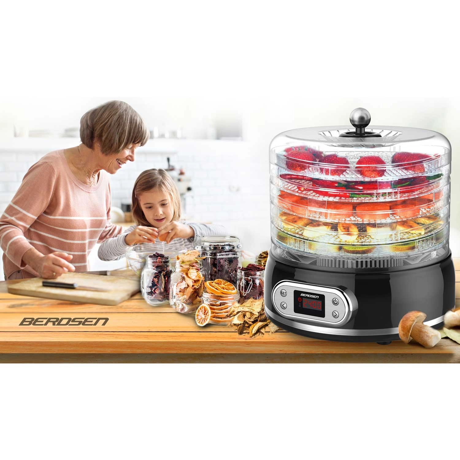 Profitez du séchage maison des champignons, fruits, légumes, herbes et viandes toute l’année. Le déshydrateur alimentaire Berdsen offre une capacité de 10 l, 5 plateaux transparents, une réglage continu de la température de 35 à 70 °C et une minuterie numérique de 1 à 72 h. Grâce à la circulation thermique, il sèche uniformément et rapidement, dispose d’une protection contre la surchauffe et répond aux certifications de sécurité CE et RoHS.