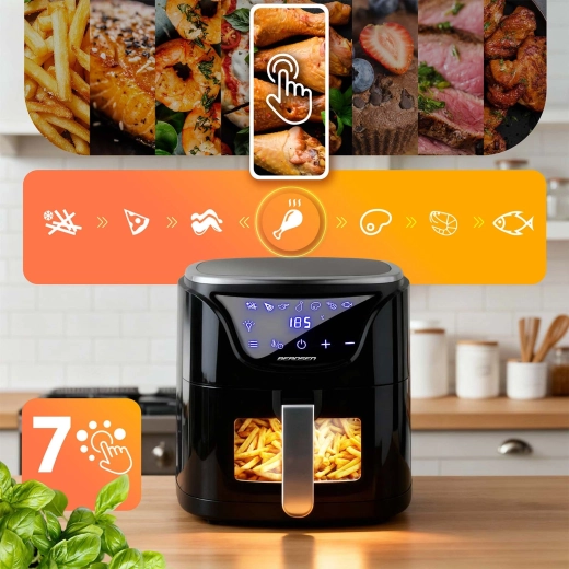 Découvrez une vraie polyvalence en cuisine : en plus de la friture à l’air chaud, la friteuse cuit, grille, réchauffe et déshydrate fruits et légumes. 7 programmes intelligents règlent automatiquement le temps et la température idéals pour les frites, la pizza, les ailes, les pilons, le steak, les crevettes et le poisson. Inclus également : réglage de la température jusqu’à 200 °C, minuteur 0–60 min, pratique éclairage LED et rappel pour retourner le plat.