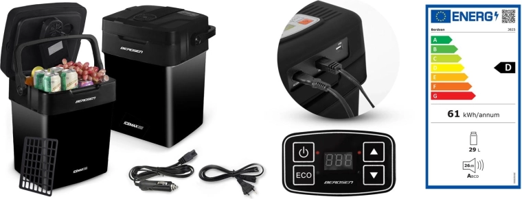La glacière électrique portable BERDSEN ICEMAX d’une capacité de 29 litres est un compagnon fiable pour les voyages, le camping et la plage. Grâce à la technologie thermoélectrique, elle peut refroidir jusqu’à 18 °C en dessous de la température ambiante et également chauffer jusqu’à +65 °C. Deux modes — ECO pour une consommation réduite et Normal pour des performances rapides — vous permettent d’adapter le fonctionnement à vos besoins.