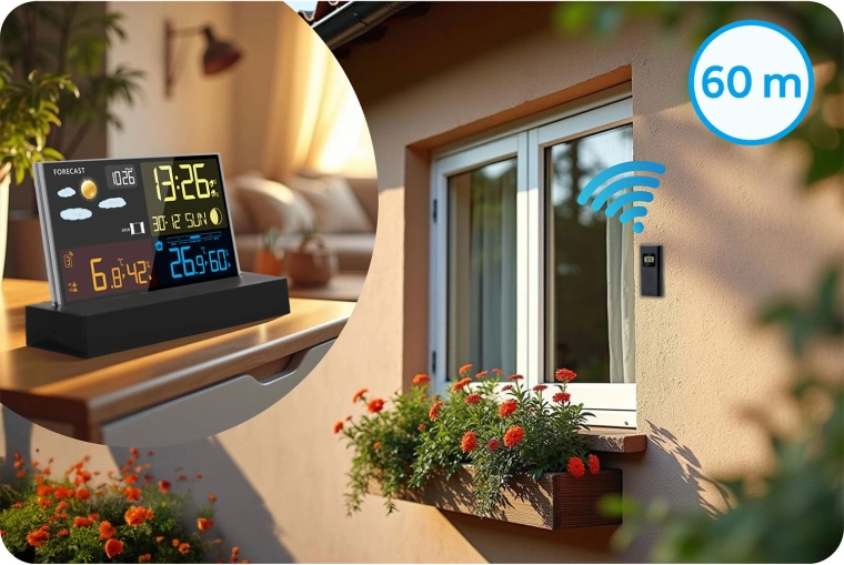 - Larges plages de mesure : intérieur -9,9 à 50 °C, extérieur -40 à 70 °C, humidité 20–95 % HR, pression 850–1100 hPa